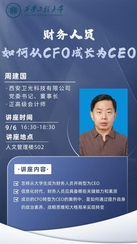 周建国以“财务人员如何从CFO成长为CEO”为主题,分享了个人职业生涯的精彩历程,并分析会计未来发展趋势,给同学们提供了宝贵的职业发展指南。