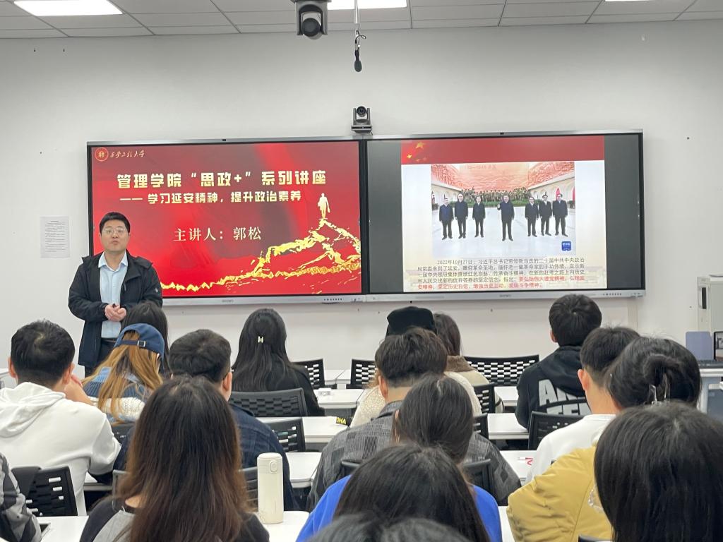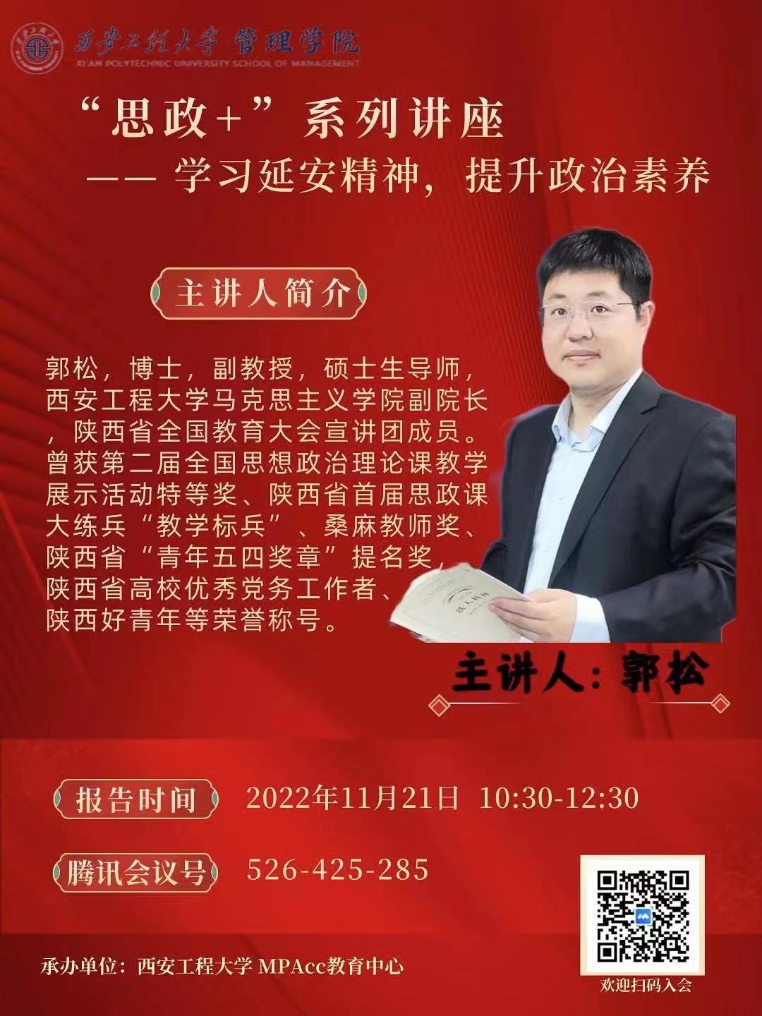 2022年11月21日上午10:30-12:30,威廉体育williamhillMPAcc教育办公室特邀公司马克思主义公司郭松副教授在人文管理楼502为2022级研究生作了《学习延安精神,提升政治素养》的报告。2022级MPAcc全体在校同学线下参会,其他研究生通过腾讯会议线上参会。
