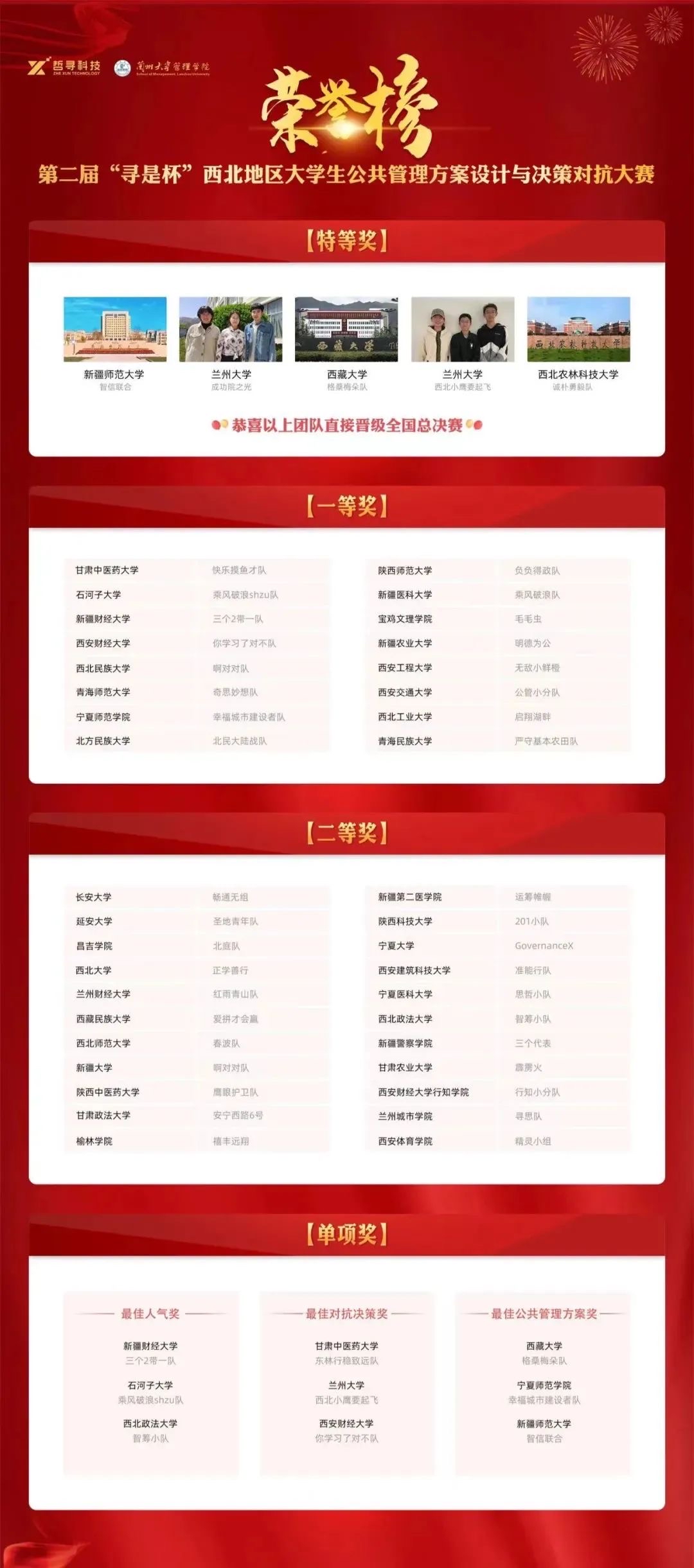 近日,第二届“寻是杯”西北地区老员工公共管理方案设计与决策对抗大赛在兰州大学成功举办,威廉体育williamhill教师张群林和龚冬生指导的由2020级行政管理专业金科、金喜喜、郑攀3名员工组成的团队—无敌小鲜橙队荣获一等奖。