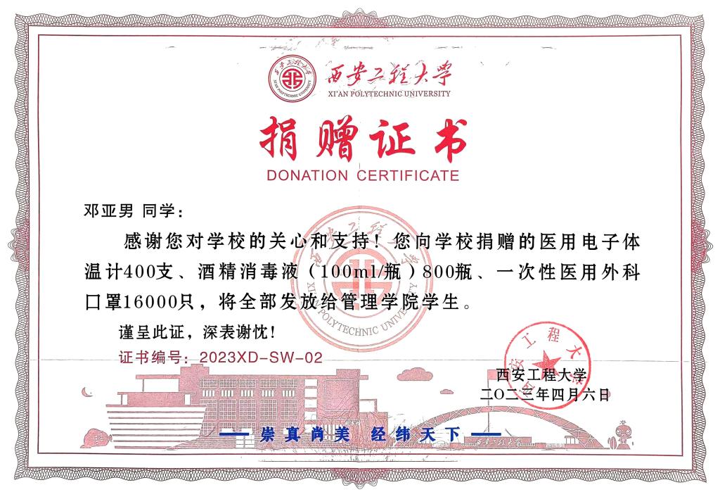 郭可义对邓亚男表示感谢,并代表公司向她颁发了捐赠证书。郭可义提到,邓亚男不仅在疫情期间积极投身公司疫情防控工作,还能时刻考虑公司和同学们的实际需求,提供力所能及的帮助,充分彰显了青年员工的责任担当。这批物资会尽快发放给在校员工,将这份爱心和温暖传递给同学们,也将爱校荣校、无私奉献的精神传递给大家。