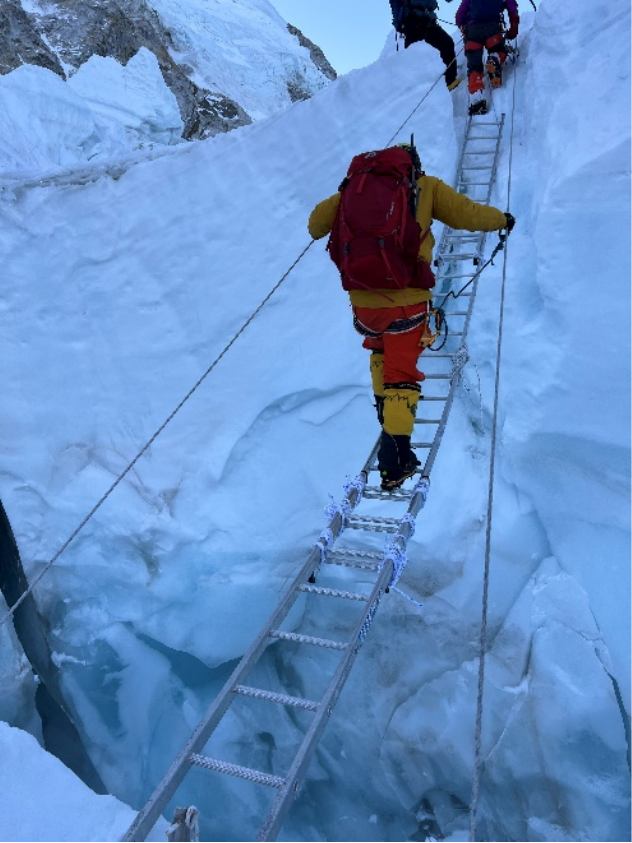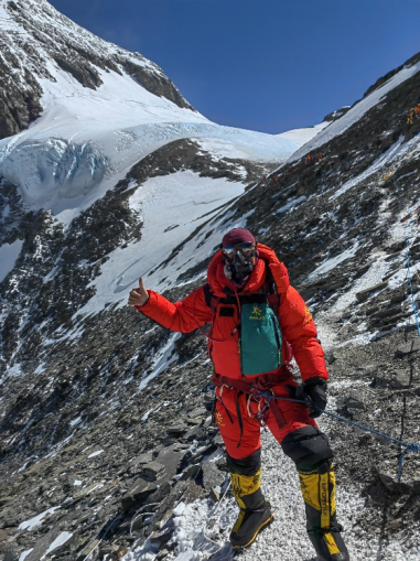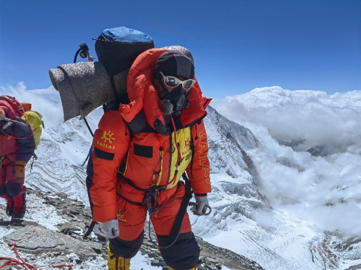 紧接着,他的语气从惶恐不安逐步开始变得平稳起来,“ 终于在这个位置遇见了老朋友达瓦G夏尔巴,他是一位新加坡队友的向导,也是这次珠峰南坡修路队的队长。为了保证能继续操作下降器,我和新加坡队友互换了向导,达瓦G把他的氧气换给了我,他自己无氧带着我下降。达瓦G是资深的持证国际高山向导,他见我神情恍惚,下降困难,在雪厚路段,他直接绑着我下放,其它路段则使用下降器,并不断跟我说话。就这样,我坚持着一定要回到C4营地这个念头,终于在下午3点,总共花了8个小时,安全下撤到了C4营地。”说完这些话时,他的神情已经不仅仅是一份经历风雨后的深沉,更多的是一种站在顶峰无畏艰难险阻的坚定。