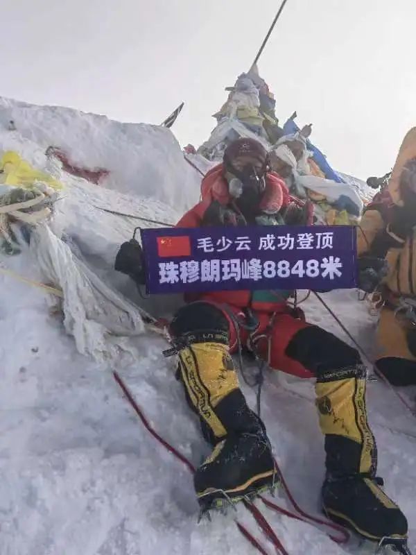 毛少云说:“我是5月13日开始正式‘冲顶’,依次经过海拔5900米C1营地、海拔6400米C2营地、海拔7100米C3营地、海拔7950米C4营地。5月16日晚20点开始,我从C4营地冲顶,尼泊尔向导夏尔巴帕桑.尼玛带着我一路‘超车’,终于在5月17日6时45分到达峰顶,成为这支队伍第一个登顶的中国人!”