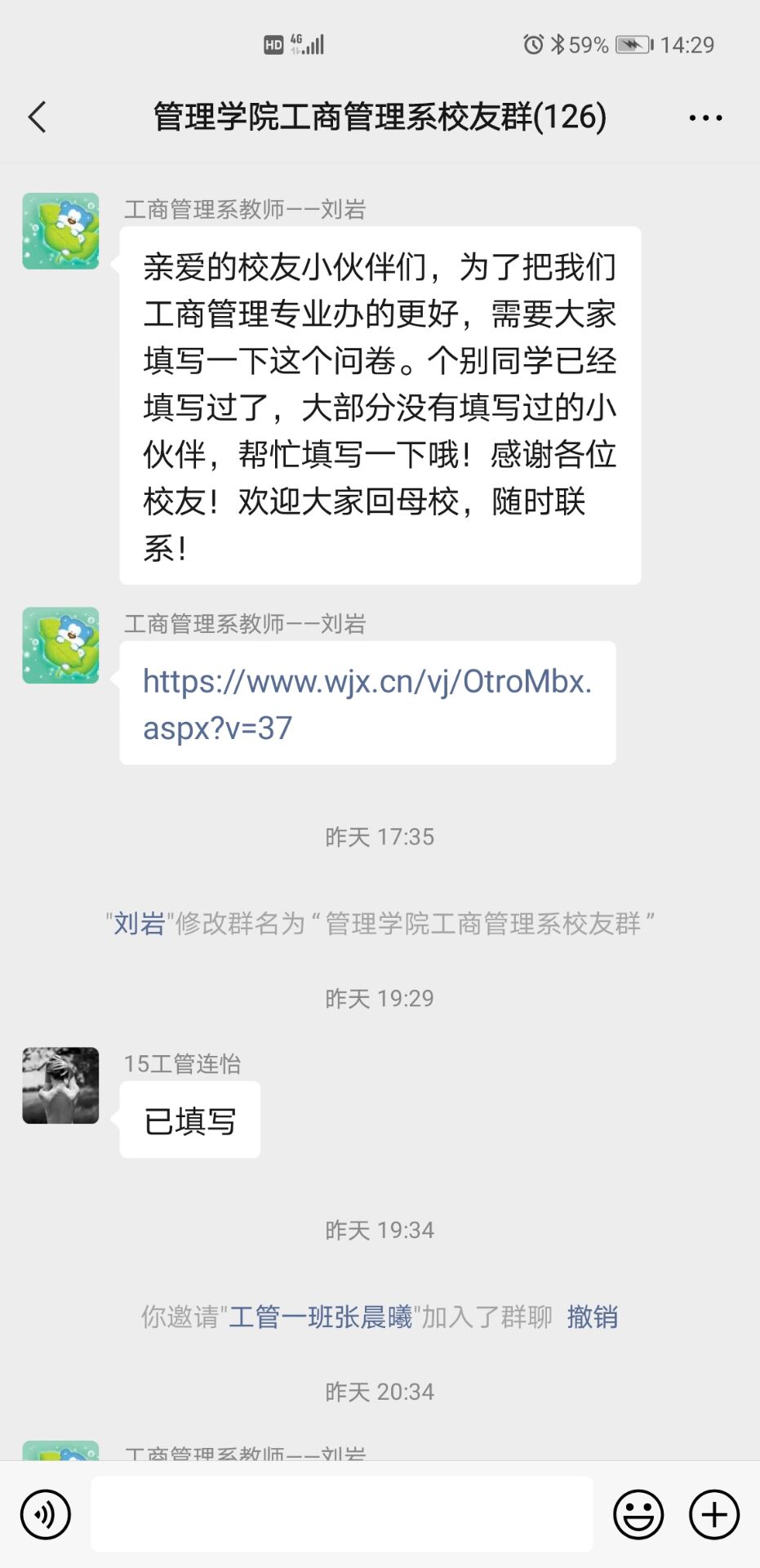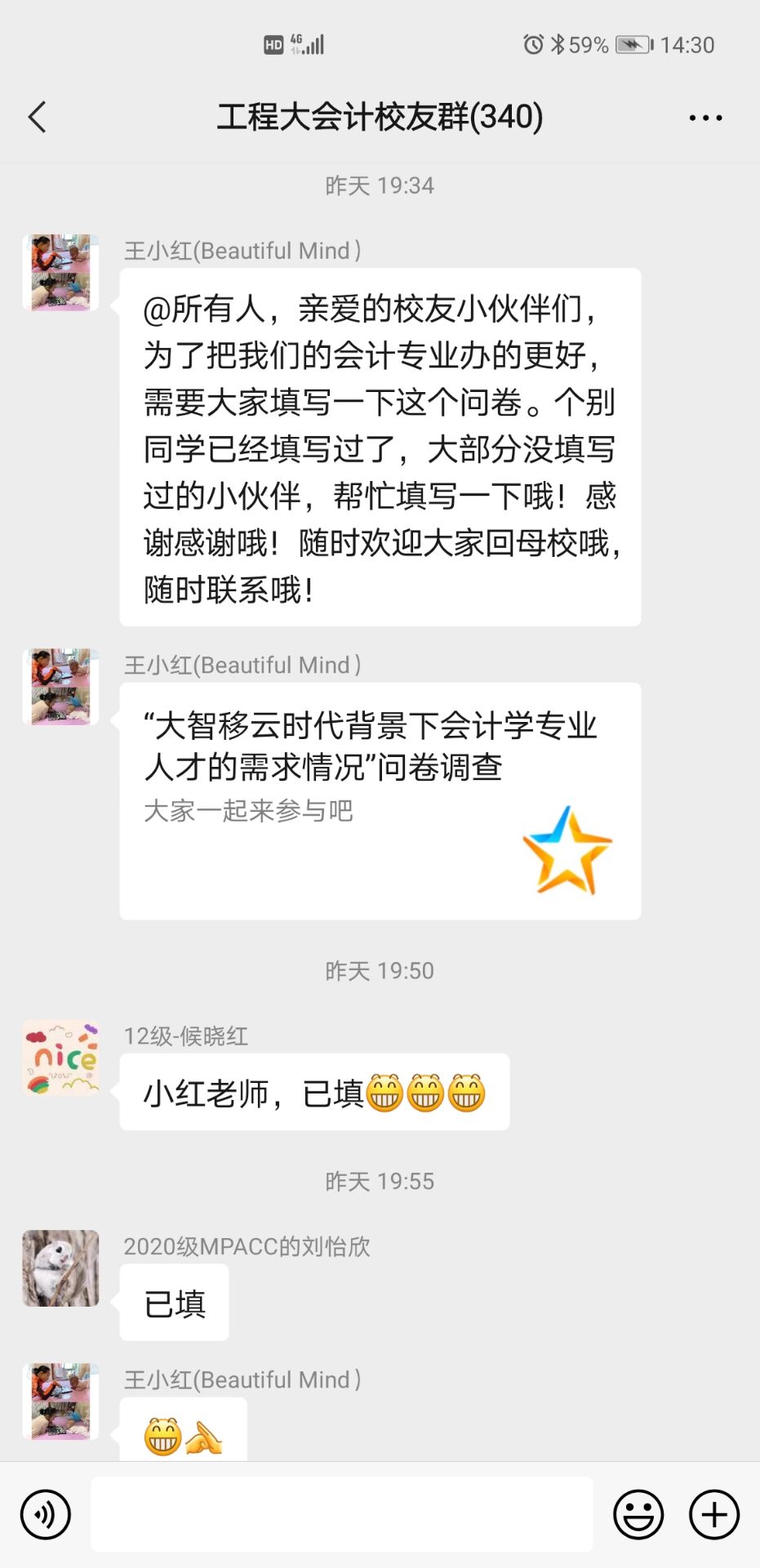 为了加强公司员工工作,发挥员工在产学研合作、校外实习基地搭建、课程设计与人才培养体系优化、就业指导与帮扶、三全育人工作推进等方面的作用,根据近期公司工作安排,威廉体育williamhill“三全育人”导师团成立了各专业员工群,进一步畅通员工联系渠道。已成立的员工群包括工商管理、信息管理与信息系统、行政管理、人力资源管理、国际经济与贸易、市场营销、会计学七个本科专业员工微信群。成员包括各专业员工、公司员工会全部理事、各系老师。