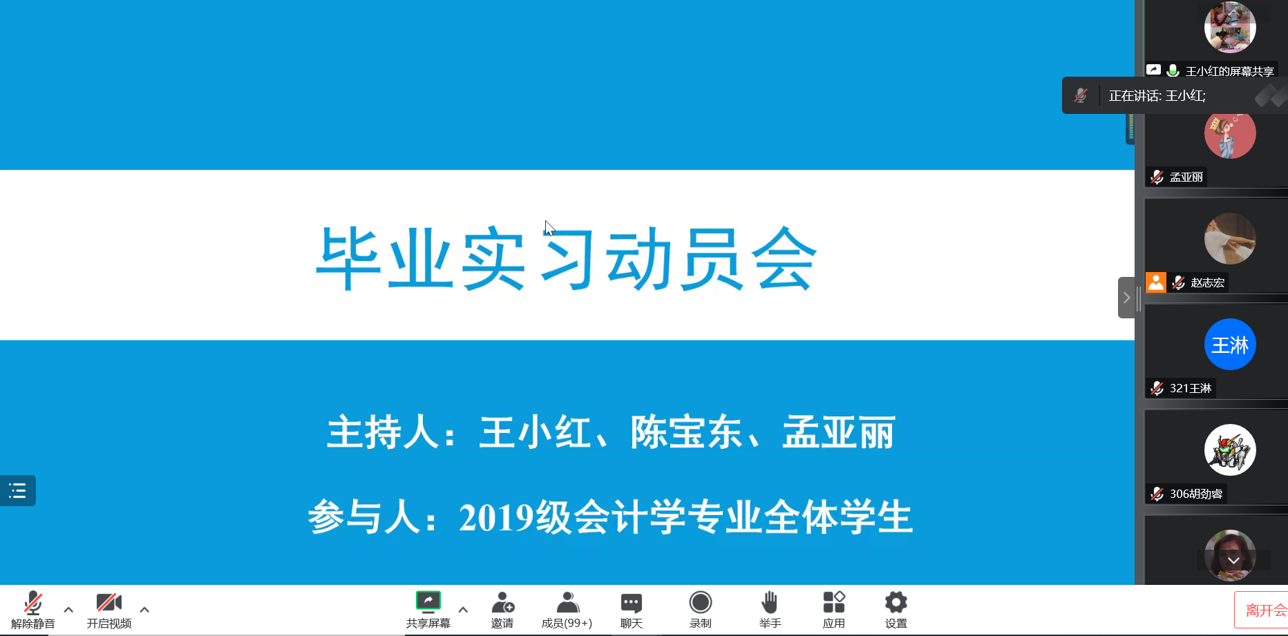 2022年11月19日19:00时,威廉体育williamhill会计系利用腾讯会议开展“会计系三全育人导师团系列活动之毕业实习动员会”,会议由会计系主任王小红老师主持,会计系副主任陈宝东老师,教师孟亚丽老师与2019级会计系全体员工参加本次会议。