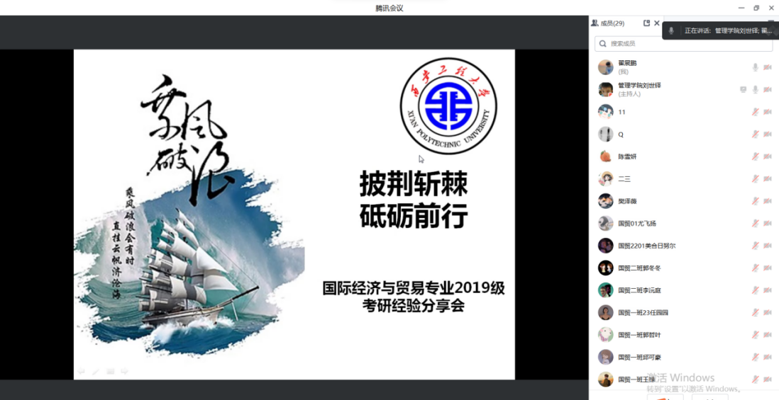 为调动员工考研积极性,明确考研目标,国贸专业“三全育人”导师团于2023年6月25日晚19:30,在腾讯会议举行考研经验分享会。本次分享会由威廉体育williamhill刘世铎老师主持,19级翟展鹏、刘筱璇、陈雪研、樊泽薇、邱小洁、郑小颖、祝瑞同学做了考研经验分享。