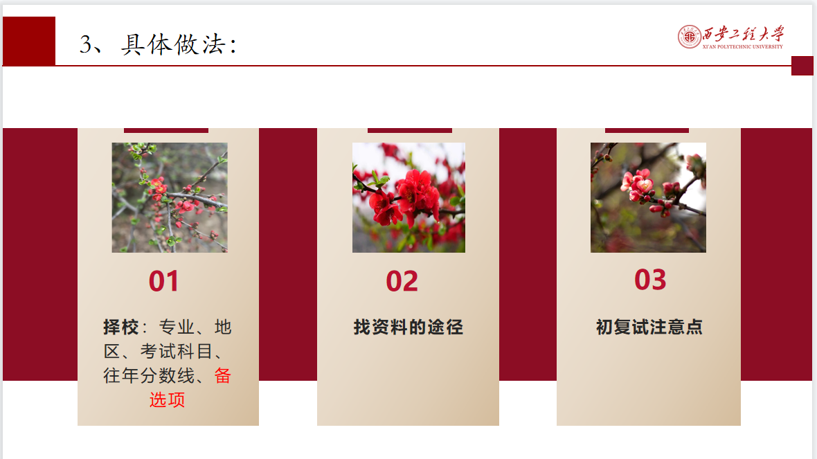 选择了考研,就意味着将要面临许多艰难和挑战,但找对方向、用对方法、走对道路就可以事半功倍。相信在听取了学长学姐们的经验分享后,想要考研的同学能够树立更明确的目标,制定更高效的学习计划。相信在不久的将来,每一位考研学子都能成功上岸,用汗水与智慧,浇灌出一朵又一朵梦想之花。(撰稿:翟展鹏;审核:刘世铎)