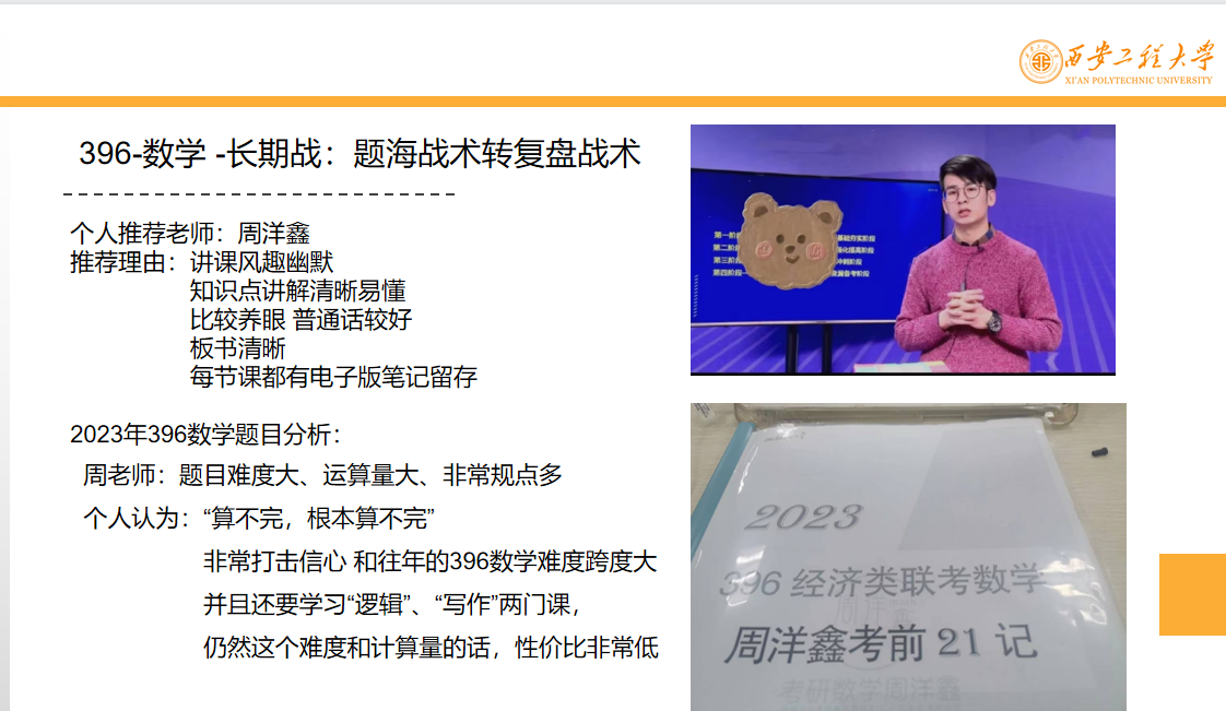 随后上岸兰州理工大学国家商务专业的陈雪研学姐向大家介绍了经济类联考综合能力(简称396经综)及专业课的复习经验,她着重向大家推荐了一些学习经济类联考的渠道及学习方法,同时强调专业课一定不要自己给自己画重点,对学弟学妹们考研复习有很大的帮助。