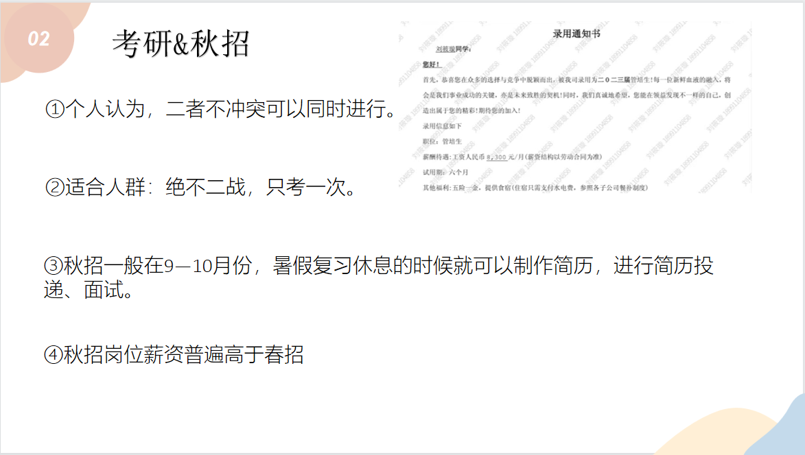 接着刘筱璇学姐就考研和秋招的问题向大家进行介绍,她表示考研和秋招并不冲突,在考研的同时,可以利用暑假学习空余时间制作秋招简历,进行简历投递及面试,因为秋招总体上需求岗位及薪资普遍高于春招。