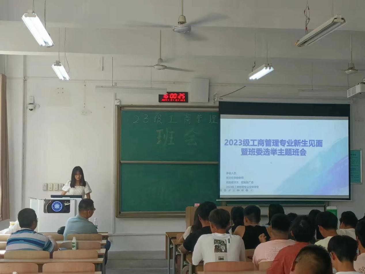 3.班委选举。历经员工申请——班主任面试——全员选举的流程,秉乘民主公平公正的原则,最终选举出了23级工商管理1班和2班的班长、团支书和学习委员。成功当选班委的同学在老师同学的面前立下庄严承诺——为共同建设优良学风、团结一致的班级而笃行不怠。