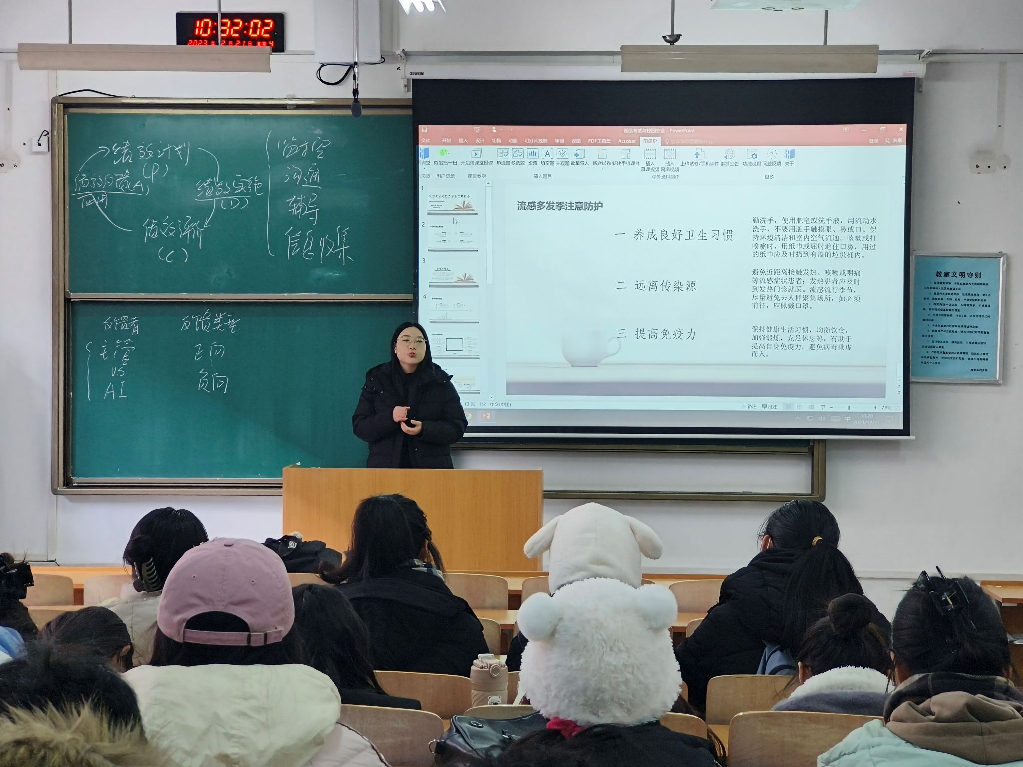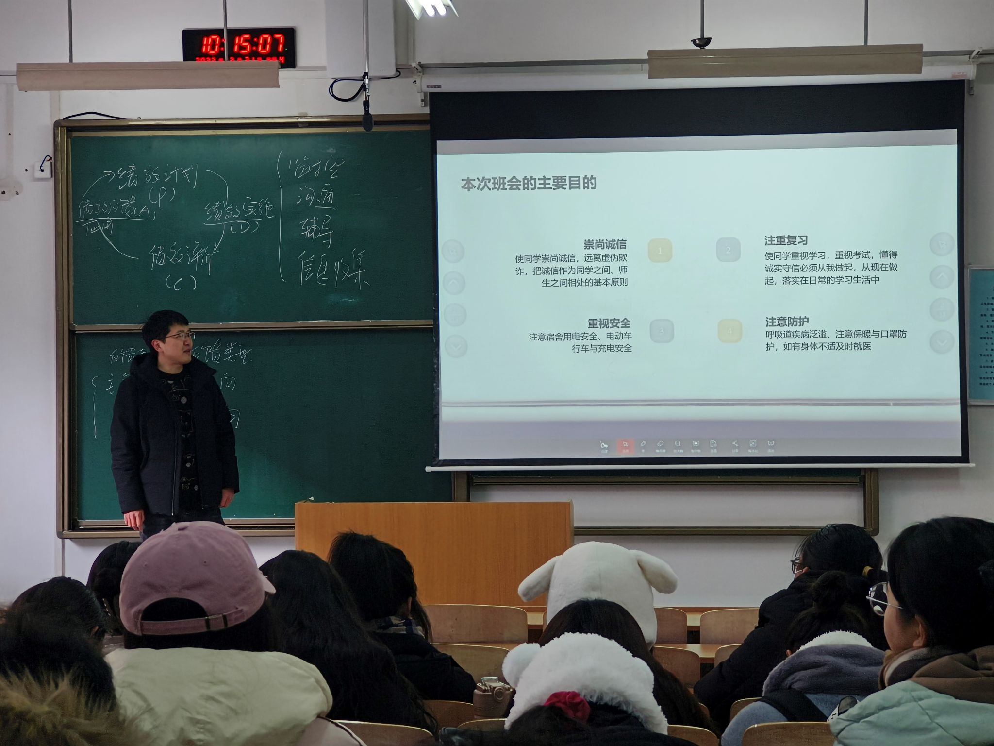 会议伊始,李蒙老师针对班会的目的进行了详细阐释。他从复习的重要性及诚信的深远意义两个方面入手,强调大一员工在日常学习中应注重效率和成效,同时从个人做起,践行诚实守信的原则,不仅在日常生活中,更要在考试过程中体现出来。紧接着,孟亚丽老师详细讲解了冬季安全防护的必要措施,提出了“培养健康生活习惯、避免接触传染源、增强个人免疫力”三大关键策略。