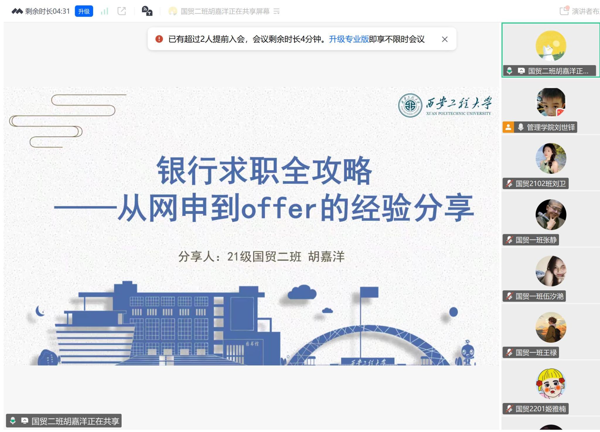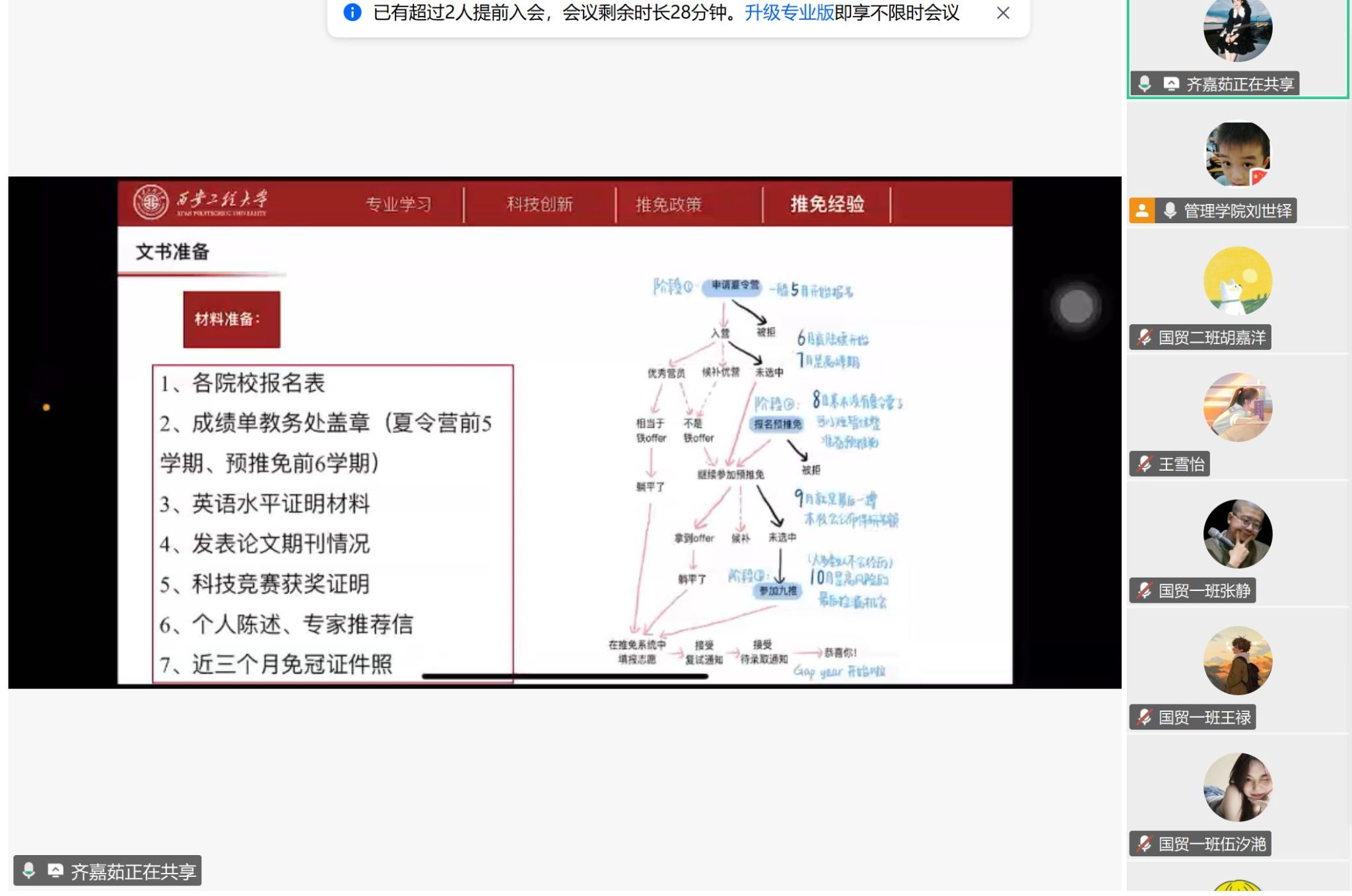 为帮助员工更好地了解相关信息,制定合理的未来规划,国际经济与贸易专业三全育人导师团于6月12日通过腾讯会议举办了升学就业经验分享会。此次分享会吸引了众多员工参与,现场气氛热烈。刘世铎老师主持会议,并强调在就业形势复杂多变的情况下,获取有效经验和建议对员工的重要性。