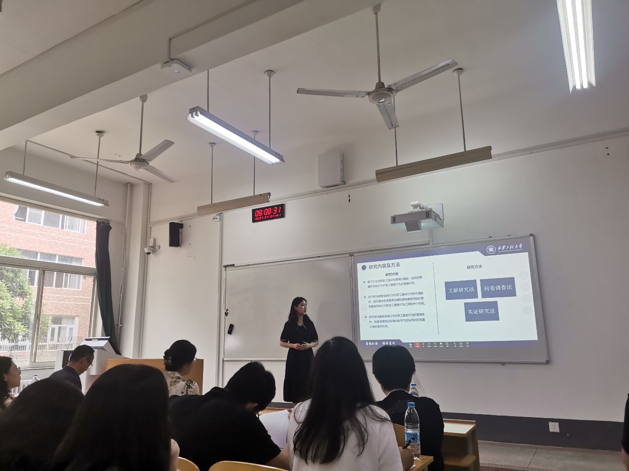 此次答辩分为两部分,首先由唐萍、张晶晶、丁悦三位同学进行示范答辩,全体毕业生进行观摩。三位同学分别由马贵梅、王宁、贾艳玲三位指导老师推荐,就实证研究和案例分析两种不同的研究方法进行了演示,展现了扎实的学术功底和高超的研究水平,获得了评审的高度赞扬。