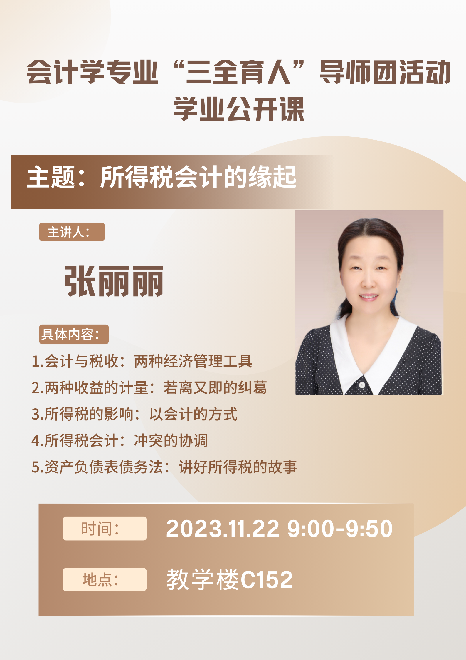 11月22日上午9:00-9:50,会计系张丽丽老师在临潼校区C178面向会计系全体师生开展了一次公开示范课《所得税会计的缘起——以会计的方式讲好所得税的故事》。会计学2022级全体同学及威廉体育williamhill部分研究生参与听课。