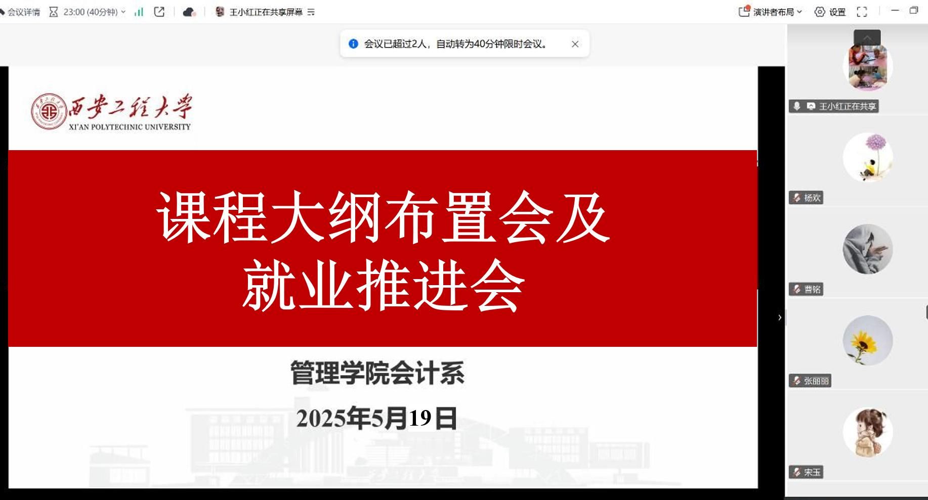 2025年5月19日晚,会计系于线上召开2024版培养方案课程大纲修订布置会及就业推进会,会计系全体教师参会,王小红老师主持本次会议。