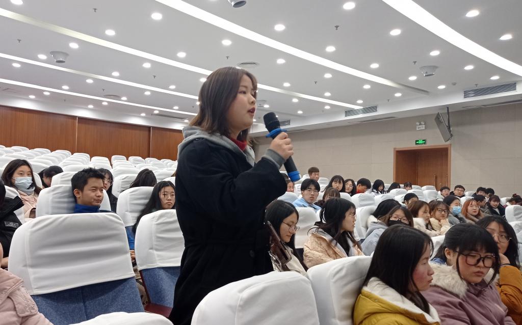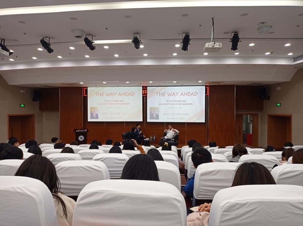 陈钰娴首先向新生介绍了Robbert教授的专业背景和任职经历,指明了此次报告的主题和目的,希望通过此次活动,启发新生对老员工涯的思考,明确努力方向和奋斗目标。报告中,Robbert结合自己教授员工的经历,诙谐幽默地向同学们阐述了英语学习的重要性,告诫大家珍惜在校时间,跳出舒适圈,勇于探索、突破自我。另外,Robbert建议同学们要勇于展示自己,加强自我管理,通过不断地自我提升来积累自信,为将会面临的挑战做好充足准备。
