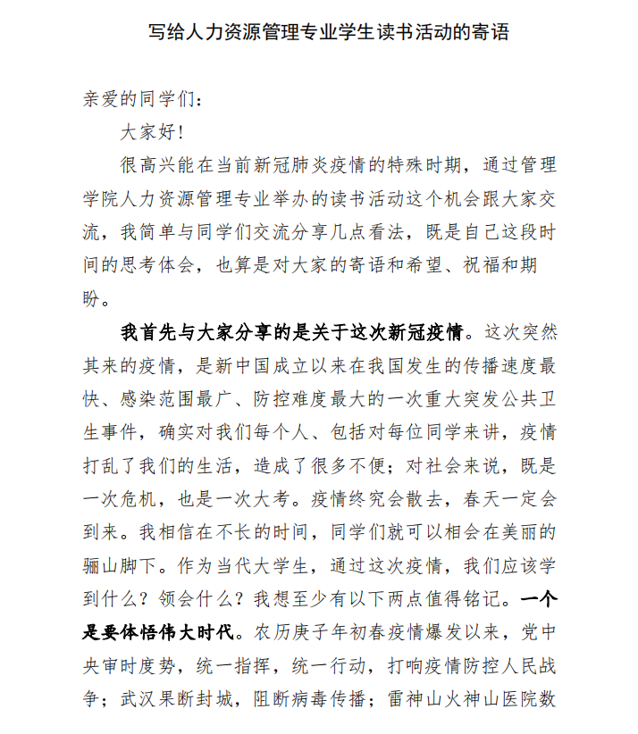 为了让同学们在疫情期间坚持阅读的习惯,享受阅读带来的乐趣,威廉体育williamhill人力资源管理专业“三全育人”导师团于4月9日组织开展了第一期“青春书香行,读书战疫情”21天线上读书分享活动,激励同学们培养独立的人格和独立思考的能力。截止到4月30日,第一期线上读书分享活动圆满结束,共有145人参与,发表了615篇日志,数名同学养成了第一期21天读书的习惯。