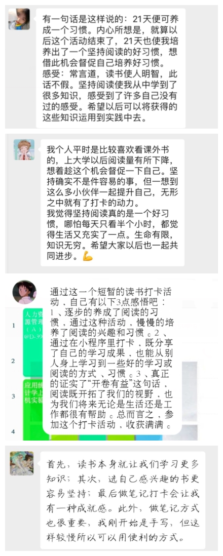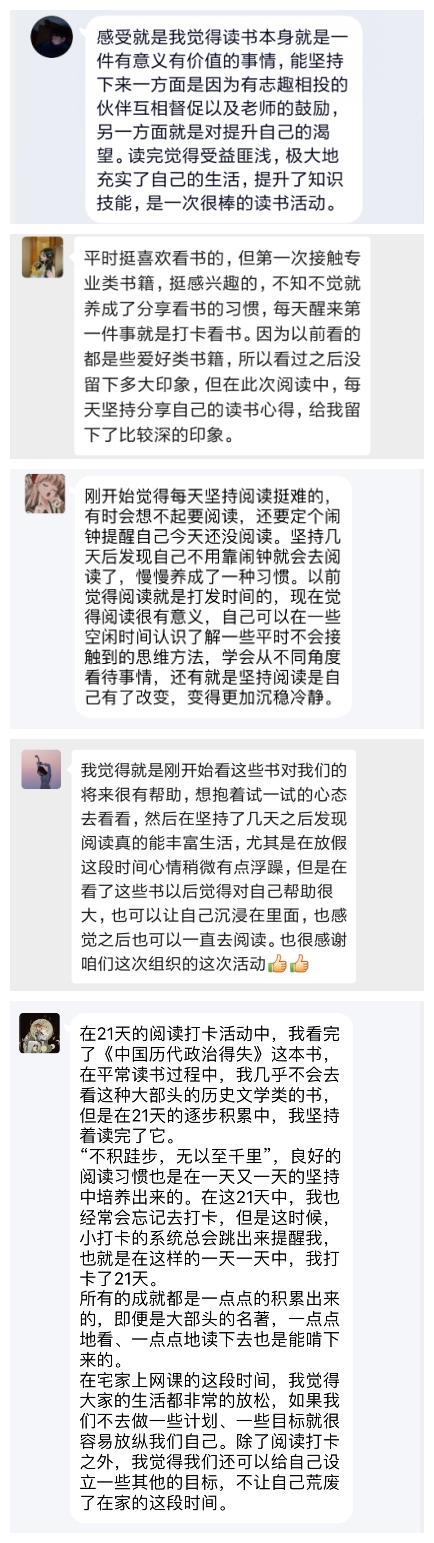 本次活动按分组进行,导师团的老师和工作组的同学提前整理出了110本书,并在活动过程中持续更新书目,供大家参考学习。活动过程中,校外导师组积极推进本次活动,指导所分小组员工读书,向同学们推荐优秀书籍;参与同学每天在小程序打卡,分享自己的读书心得,并针对读书技巧与老师进行讨论。活动结束,各读书小组分别做了活动总结,并有数名同学发表了参与本次活动的收获和感悟。同学们纷纷表示,在读书的过程中学到了很多知识,也丰富了自己的视野,要将阅读作为自己的一种终身兴趣爱好。