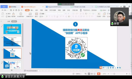 首先,谢晋为同学们讲解了本次毕业生视频双选会平台注册及线上投递简历应聘的相关事项。他讲道,毕业生就业是公司当前的重点工作,招就处在综合类双选会的基础上针对不同专业召开了多次专场双选会,而此次主要是面向人文、管理类毕业生,共有61家企业参加,希望各位同学精心准备简历,做好线上求职的各项准备,展现自己最好的状态。