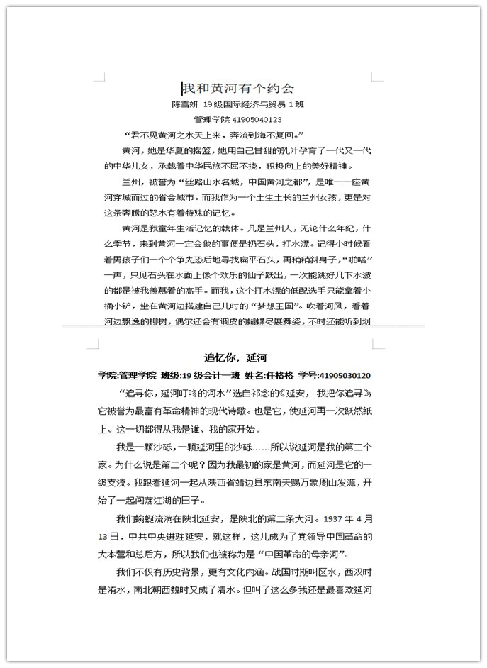 其中有优秀实践队伍心得分享,如:“19级国际经济与贸易一班陈雪妍的《我和黄河有个约会》;19级国际经济与贸易一班杨万敏的《我爱家长河-汉江》;19级会计一班古若良的《港湾》;19级会计一班雷欢婷的《吾心安处是吾乡》等”