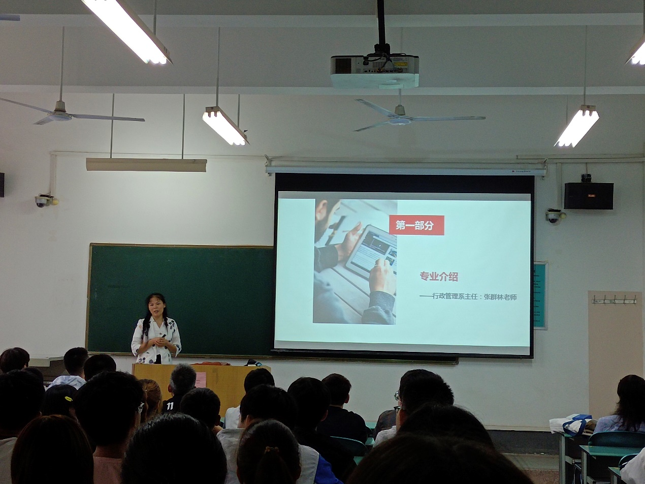 张群林老师首先致欢迎辞,对2021级新生表示了热烈欢迎,亲切的话语表达了对新生的欢迎和期望。随后,她从学科门类、专业涵义入手向大家介绍了我校行政管理专业的发展历史和专业现状。在生动图片的辅助下,她为大家展示了本专业员工丰富多彩的校园生活。最后,她提出了四点建议和要求,即希望新生们能尽快适应老员工活,制定规划,奋发图强,砥砺前行。