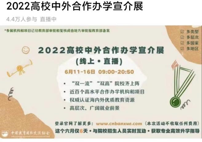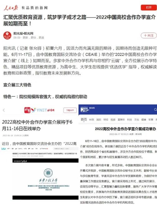 近日,由中国教育国际交流协会主办的“2022高校中外合作办学宣介展”于线上拉开帷幕,国内近百家高水平中外合作办学机构和项目共话新时代中外合作办学发展,中国教育电视台、新华网、人民日报、新浪教育、北青网等官网媒体均对本次活动进行关注报道。
