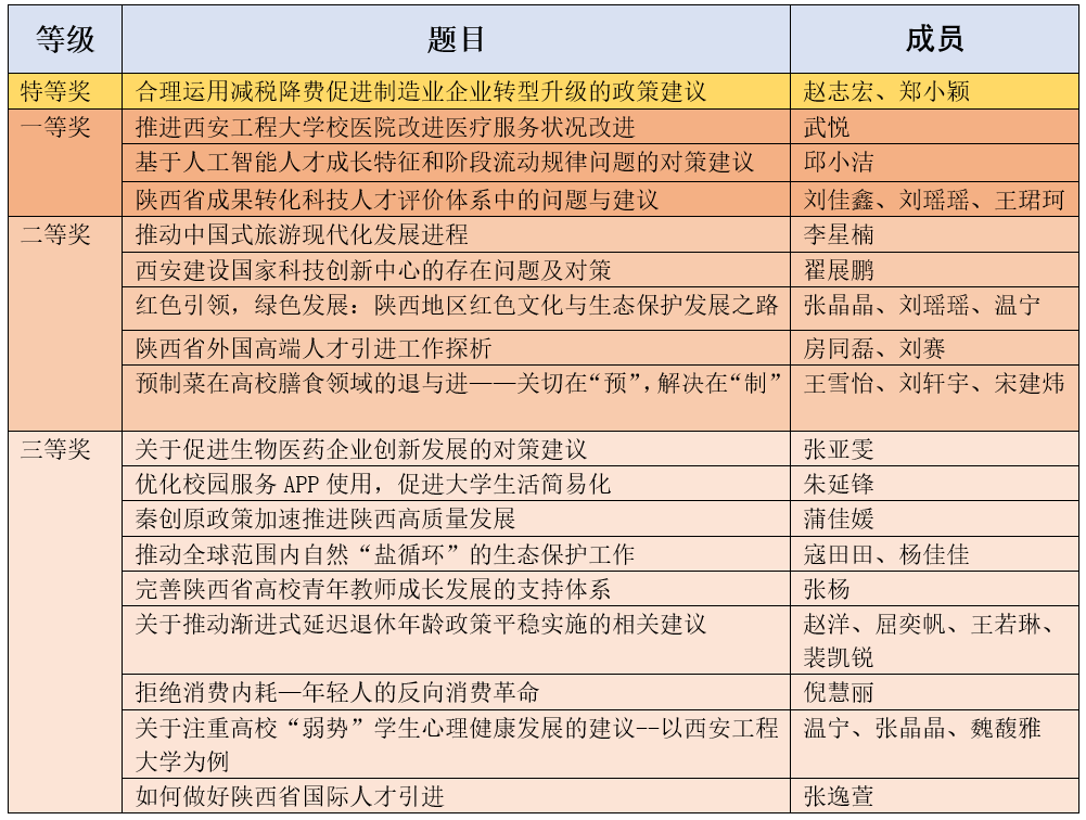 大赛收到了来自校内外不同专业同学的作品,参赛作品围绕科技创新、人才集聚、绿色经济、公司发展等领域,深入进行剖析并提出意见建议。其中科技创新领域的作品涉及秦创原、双中心、数字技术、成果转化、创新机制等话题;人才集聚领域的作品涉及创新创业、人工智能、女科学家、国际人才等话题;绿色经济领域的作品涉及生态保护、绿色直播、新能源汽车、旅游、双碳等话题;公司发展领域的作品涉及校医院、就业服务、校园服务、教师发展、食品安全等话题。