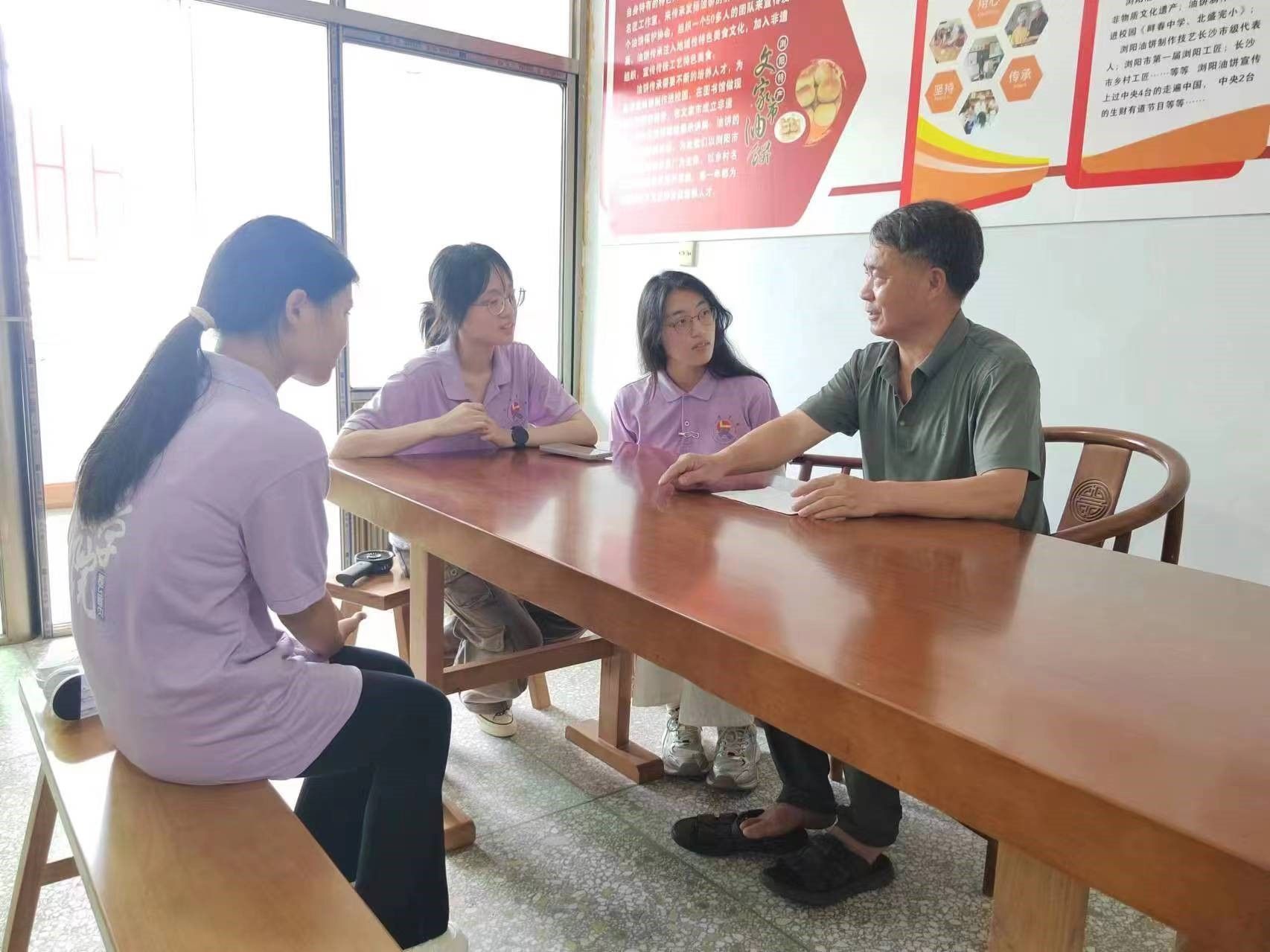 7月16日上午,实践团队成员前往长林食品厂,拜访了湖南省非物质文化遗产浏阳油饼的传承人彭长林老师。彭长林老师是浏阳油饼制作技艺的杰出代表,他自18岁开始跟随师父学习制作油饼,至今已有30余年的经验。