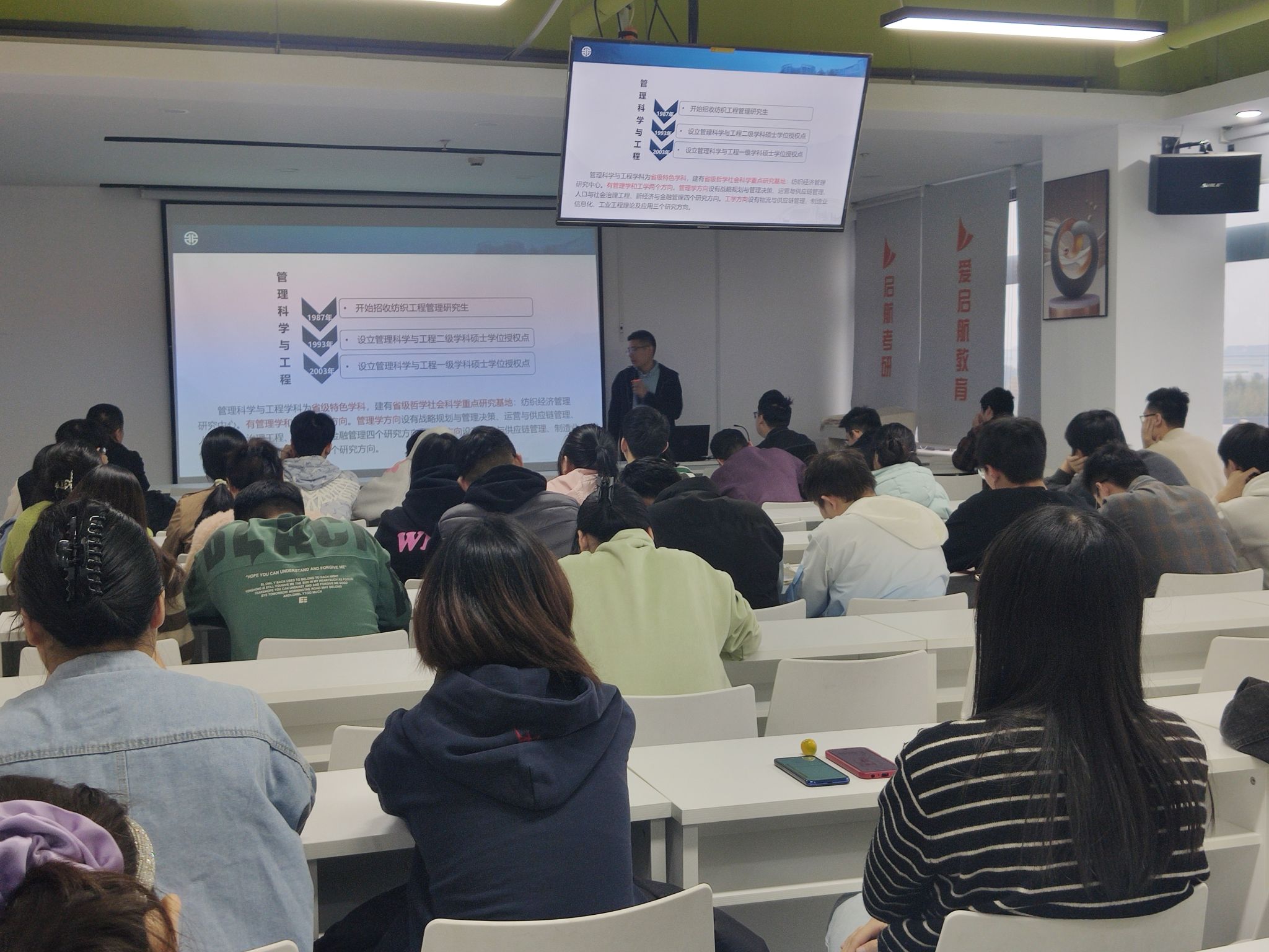 期间,公司研究生招生团队分三组先后前往济南启航考研培训基地、海浪教育集团、山西工商公司、高顿教育、铭途教育集训基地、宁波工程公司、浙江万里公司、宁波大学、浙大宁波理工公司、浙江工业大学开展了现场招生宣讲工作。并赴济南高新技术产业开发区、山西建设投资集团有限公司、天坤控股山西分公司等单位进行在职研究生教育招生宣讲。招生团队围绕公司和公司概况、团队队伍、教学特色、学科专业、软硬件环境等方面内容全面展示了公司的研究生教育优势和招生政策。此外,招生团队还与考生们进行了座谈,深入了解他们的需求和期待,针对员工们关心的报考专业、教学条件、就业前景等问题进行了耐心细致地解答,有效激发了员工们报考公司的热情。