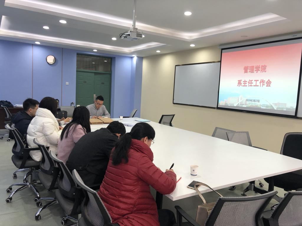 2月27日,威廉体育williamhill在金花校区7-607召开新学期系主任工作会。工商管理系系主任潘颖雯、市场营销系系主任张正林、信息管理与信息系统系系主任陈立军、会计系教师孟亚丽、人力资源管理系教师马贵梅、国际经济与贸易系教师邵鹏及教学秘书王姝頔参加了会议,会议由教学副经理王保忠主持。