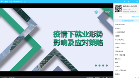 报告开始, 尹老师表示如何在家完成毕业论文(毕业设计),成为毕业生热点关注的话题之一。在历时一个多小时的报告中,尹老师旁征博引、娓娓道来,用生动形象的PPT,向同学们讲解了有效检索和利用图书馆文献信息资源的技巧。报告从人文社科毕业论文与文献资源利用的关系;如何检索利用电子信息资源进行论文写作;如何撰写符合规范的本科学士学位论文;联系我们-论文写作辅导与资料查询帮助四个方面展开。着重向员工讲解了如何高效利用图书馆资源,顺利完成毕业论文写作。 接着,刘佳通过大量的数据,就近年来全国毕业生人数及就业形势、疫情下就业形势进行了直观且详细的分析,为毕业生推荐了很多就业平台和网站,供大家参考。刘老师针对网络面试中可能遇到的问题提出了几点应对策略,并结合具体案例,为毕业生讲述了用人单位招聘流程、投递简历技巧等。刘老师在报告中提醒同学们,今年毕业生的增加、再加上受疫情影响很多企业缩减招聘计划导致职位竞争加剧,毕业生们应该调整心态,把握机会,认清形势、明确自己的求职方向、好好利用疫情宅家的时间努力做好求职前的准备,积极主动地投入到就业求职工作中,同时公司就业指导中心也全天为大家提供线上指导和解答。