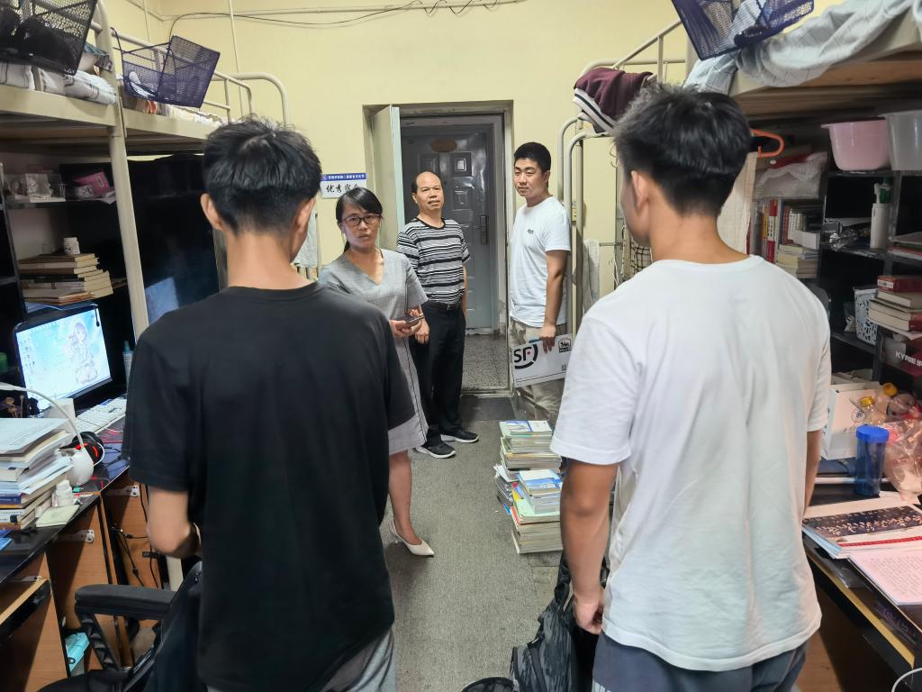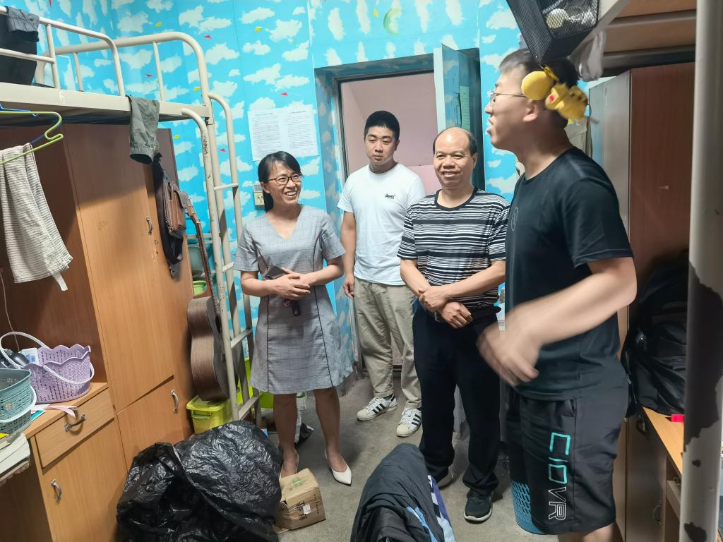 2021届毕业生离校在即,为保障毕业生安全稳定离校,欢送毕业生开启人生新篇章,管理公司党委书记徐焕章,经理李艳,毕业生辅导员姚壮和辅导员吴昌敏走进员工宿舍,看望毕业生。