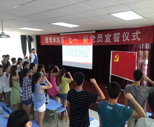 仪式上,代锴宣读了2014、2015年新发展党员名单并对他们表示祝贺。随后,面向鲜红的党旗,全体党员在副书记张冬梅的带领下,庄严地宣读了入党誓词,进一步深刻领悟所肩负的光荣责任和崇高的历史使命,表明为党的事业、为共产主义奋斗终身的决心。接下来,新党员代表13级行政管理专业吕德胜同学代表所有新党员发言,他表示将时刻谨记党的教诲,践行入党誓词,在学习和日常生活中发挥模范带头作用,为党旗增光添彩,不愧对共产党员的光荣称号。