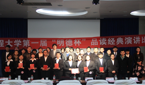 最后王进富做了点评总结,首先指出此次活动有“三好”:第一,活动主题好,此次活动的主题是“品读经典,感悟人生”,经典书籍对人类的影响和贡献是深远而突出的,品读经典就是要让经典书籍发挥它的作用,成就自己,造福社会。第二,内容好,选手们品读的作品,古今中外,今昔对比,中外结合,内容很全面,既有勃朗特的《简爱》,大仲马的《基督山伯爵》,马尔克斯的《百年孤独》等西方经典名著,也有中国古典名著曹雪芹的《红楼梦》,当代经典名著路遥的《平凡的世界》、余华的《活着》等。第三,组织的好,明德读书社做了很多努力和准备工作,确保了今天演讲比赛的圆满成功。接着,王进富分享了自己的读书经历,鼓励同学们多读书,读好书,不断提高自己各方面的综合能力。同时,鼓励大家读万卷书,行万里路,多读书的同时多走出校园去接触和了解社会。最后,王进富对所有工作人员的工作进行了充分肯定,希望读书社的活动越办越好!