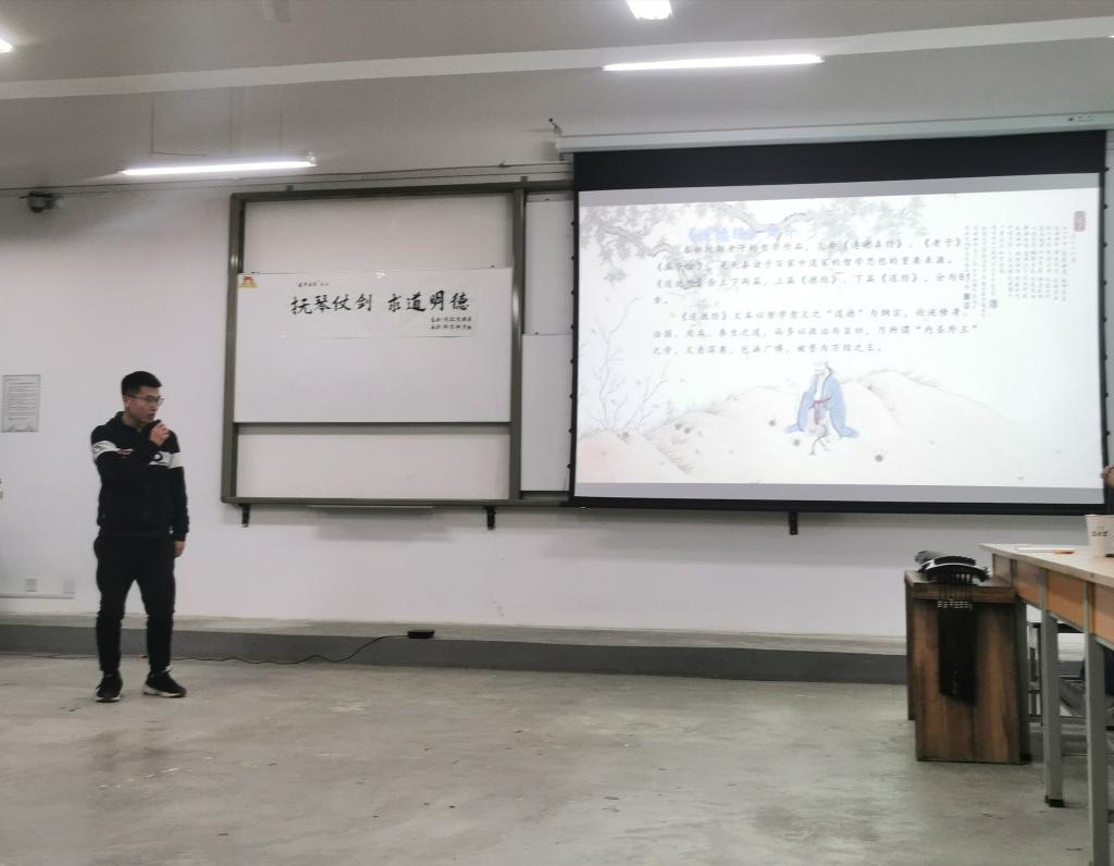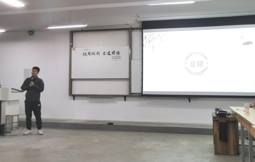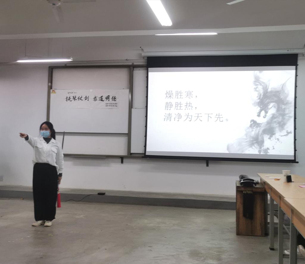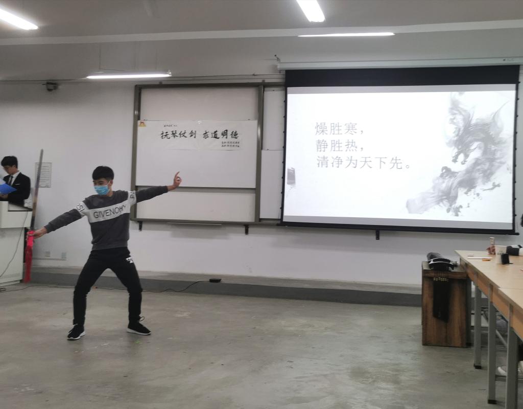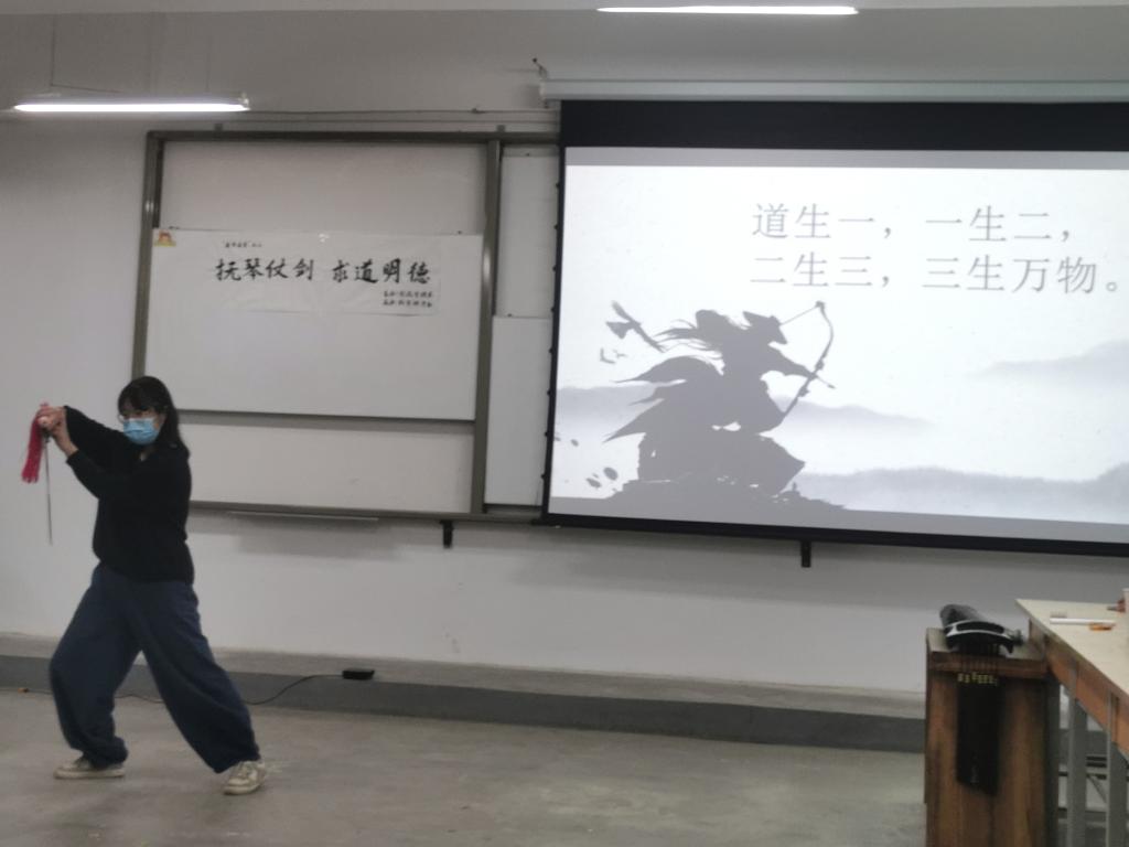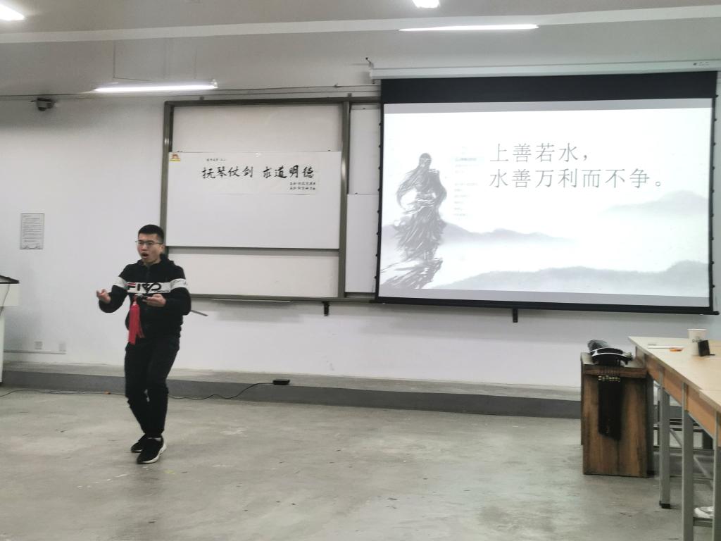 任城烨《道德经》的宣讲与王建峰、高鹏飞、张佳星、苏文杰、雷雨婷等剑社成员的太极剑表演相结合,一句句智慧之经引人深思,一招招轻柔之剑更是使人陶醉其中。随后,冯冬燕老师为我们介绍传统剑的发展历程,令我们在感叹之余颇有领悟。