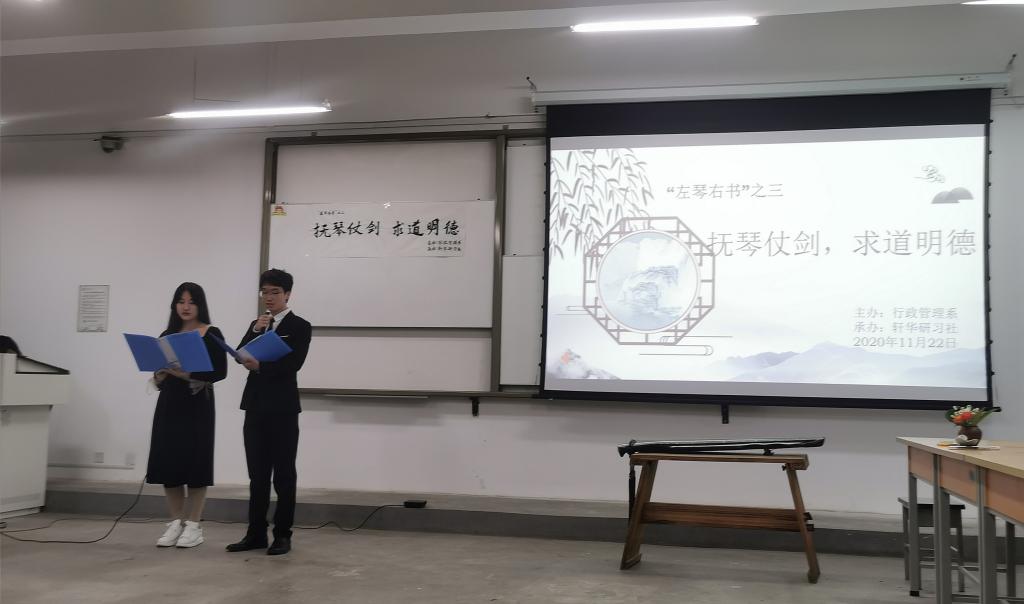 11月22日晚,喜降初雪,“左琴右书之三 抚琴仗剑,求道明德”晚会活动在临潼校区A栋教学楼402举行。出席的教师嘉宾有轩华研习社指导教师冯冬燕、行政管理导师团秘书王志刚、轩华研习社指导教师李根,线上参与的教师有行政管理系主任张群林、人文公司法学专业李燕、威廉体育williamhill团总支书记王馨可、威廉体育williamhill辅导员陈钰娴。轩华研习社社员、20级行政管理专业同学参加了本次活动。