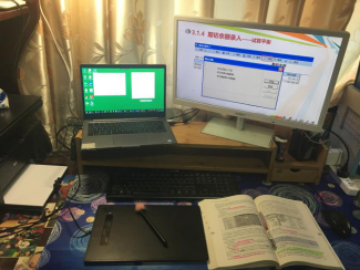 首先在上课前,我提前将下周的学习内容发至员工群,让员工能提前预习。然后在教学工具的选择上,为了能充分发挥线上教学的特点,我利用笔记本、多屏显示、手写板等教学工具,如下图1、图2,这样就丰富了教学的手段和方法,在授课的同时能够实时关注员工的反映,使得教学的效果尽量接近课堂教学。员工端的显示则如图3所示。