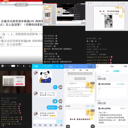 第一堂直播课是在高度紧张的状态下结束的,坚持下来却豁然开朗。线上教学不仅是线下教学的辅助,不仅可以为线下教学锦上添花,这将是一种活泼、有趣、喜闻乐见的授课方式。在线直播教学可以充分利用广泛的网络资源,提高员工们的学习积极性和主动性。腾讯课堂的同屏功能可以让员工看到教师端的操作。《金融学》既包含经典理论,又需要不断革新知识。我一直认为学习不能囿于课本,最新的资料一定要通过翻阅各种新闻去了解和掌握,而这些资料也是鲜活的、和我们日常生活密切相关的,可以充分佐证理论观点,更是员工乐意去接受和探索的(图1——在线课堂之我的超链接)。比如2020年3月份房贷换“锚”,是非常好的有关利率的案例,可以非常巧妙地运用到利率相关章节教学中,员工们接受起来非常轻松,也可以迅速应用到实践中(图2——在线课堂之理论联系实际)。3月份美联储为了应对新冠肺炎对美国经济的负面影响,采取了降息、降准的货币政策,力图实现对实体经济的积极引导;实际情况却未达到预期,此后美联储采取各种货币政策工具,配合政府的2万亿经济刺激计划,以达到救市的目的……这方面的知识一直穿插在课堂教学的相关章节中,用以佐证理论知识,让员工们也参与到资料查阅中,以了解最新的相关金融知识。每次上课之前,我会把每章的相关典型新闻在PPT内做好超链接,提前发给员工。养成每天翻阅财经新闻的习惯,并把与所学知识有关的内容推送到员工微信群和QQ群,积极与员工沟通,力求加深员工对于课堂知识的理解(图3——在线课堂之爆点推送)。课后鼓励员工积极提问,及时答疑解惑,及时布置作业,批改作业(图4——在线课堂之我的小可爱们)。