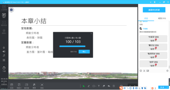 整个教学过程都很顺利,同学们表示直播过程很顺畅,偶尔的卡顿也没有太大影响,而同学们的学习情况我也得到了及时的掌握。网络授课中更多便捷有效的方式还在不停地探索中。
