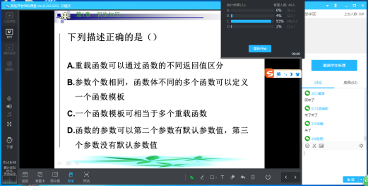 《C++程序设计语言》课程是周一早上8点,为了保证直播课质量,吴老师准备了3套方案,雨课堂+QQ平台、中国大学慕课以及腾讯课堂。对于第一周的课程还录制了有声ppt,以备网络崩溃的情况。早上7:50让员工登录雨课堂,部分员工登录不了,改为腾讯课堂后,教学顺利开展。