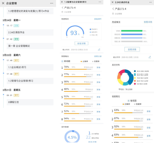 本次疫情来势凶猛,打乱了正常的教学计划,突如其来的变化,将习惯于课堂讲授的教师们推到了在线教学的一线。《企业管理》是全校非管理专业通识选修课,共有2500余人需要同时上课,12位教师组成的教师队伍年龄跨度大,老中青皆有,大家对于新的教学情况都觉得很棘手。面对新形势的要求,《企业管理》课程组第一时间组建在线教学工作群,积极应对变化,调整教学思路,在讨论中形成共识,即在线教学绝不是将传统讲授过程照搬到网络上,而是要充分利用网络教学的特点,突出员工在学习中的主体地位,建立以员工为中心的在线教学模式。在这样的教学理念指导下,课程组重新设置了员工自学和教师讲授的比例和侧重点,通过预习作业和课后作业的推送,加老员工的自学时间和学习内容,将有限的课堂讲授从基础知识升级为重点、难点知识的答疑与讲解,特别是组织员工对知识应用的讨论,真正实现了课堂的翻转,将员工被动听变为主动学、主动问、主动答。实践证明,网络教学的优势就在于通过员工课下自学相当一部分基础性知识所结余下来的时间,用于课堂上的互动、讨论和案例分析,提高员工对知识的理解和应用程度,以及问题的解决能力。