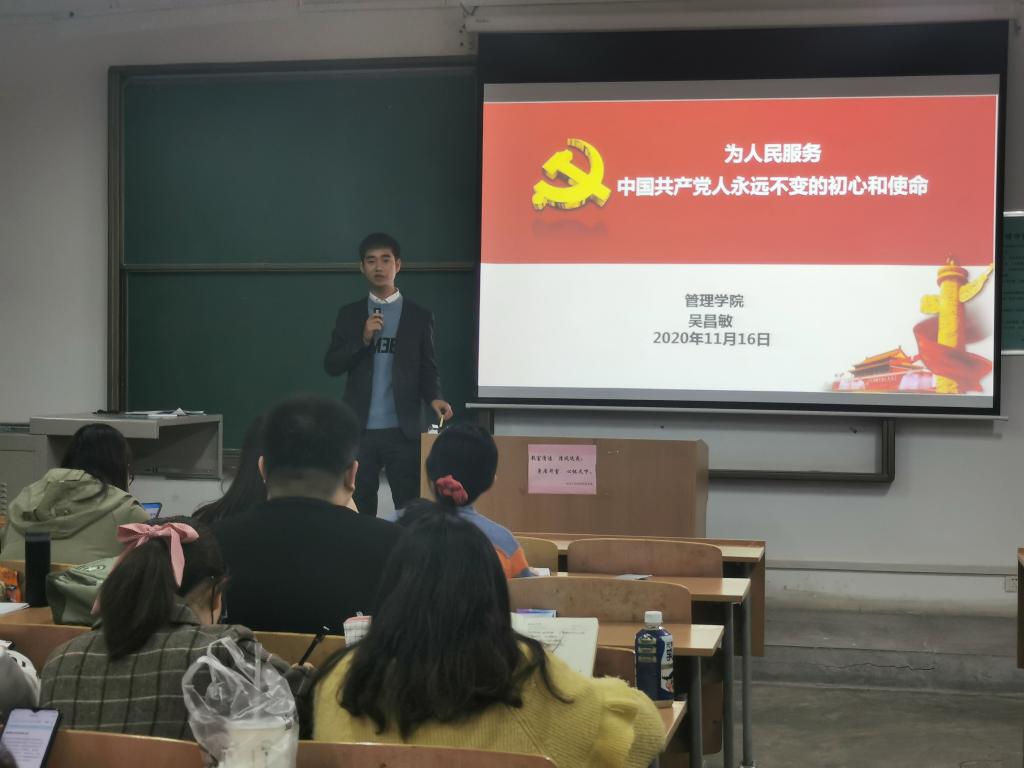 11月16日晚上七点,威廉体育williamhill第13期积极分子培训班第七讲在临潼人文楼A130顺利举行。员工第六党支部书记吴昌敏为学员们讲授了以“为人民服务——中国共产党人永远不变的初心使命”为主题的党课。