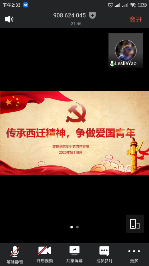 姚壮对以上发言同学做了点评,并指出“西迁精神”同“航天精神”、“延安精神”一样,都是中华民族宝贵的精神财富,弘扬和传承是我们中华儿女的“必修课”。同时还问候了毕业生党员考研复试及就业问题,并督促支部全体党员在特殊时期不断学习,充实自己。