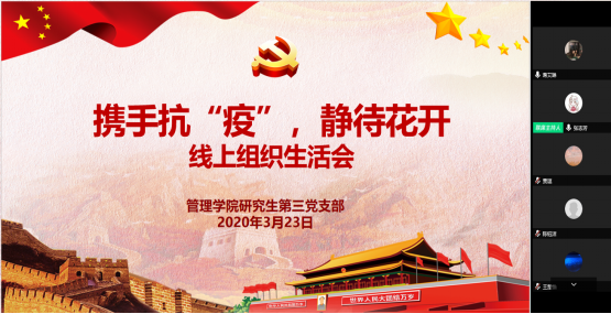 其次,全体党员共同观看了全国防疫先进事迹视频,并展开了热烈的讨论。其中入党积极分子杨佳靓分享了其在社区疫情防控工作中的体会,她说道:“疫情出现以来,无数的英雄人物涌现出来,作为研究生的我们也应为抗击疫情做一些力所能及的事情,相信疫情会早日结束,春天一定能如约而至。”