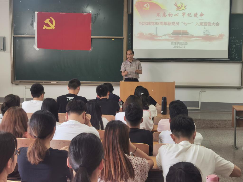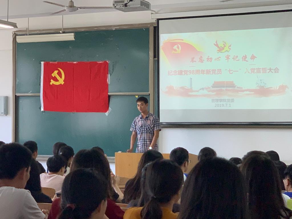 7月1日中午,威廉体育williamhill在临潼校区d3108教室隆重集会,召开“不忘初心、牢记使命”——庆祝建党98周年新党员“七一”入党宣誓大会。管理公司党委书记徐焕章,各员工党支部书记和134名新党员参加了此次大会,大会由员工第六党支部书记吴昌敏主持。