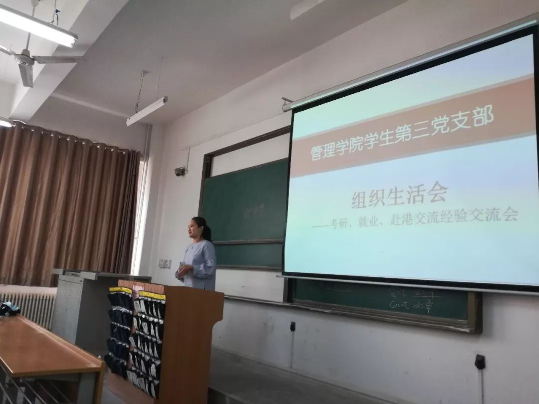 4月27日下午,员工三支部召开关于考研、就业、赴港交流经验交流组织生活会,会议由支部书记刘蓉主持,全体党员及入党积极分子80余人参加。会议邀请14级陈颖、冯银桥、孙婧怡,15级贾雪杨四位同学,就如何准备考研、就业准备、实习准备、赴港交流感受等方面和支部党员进行了交流。帮助支部党员明确了未来的目标及努力方向。