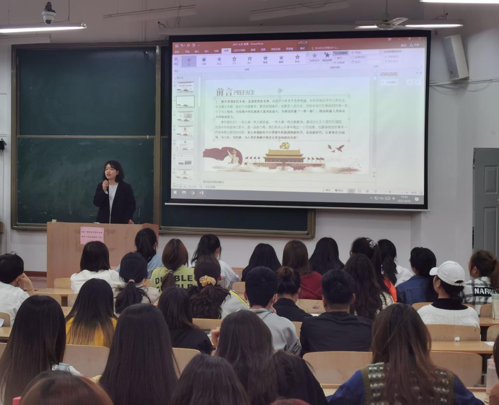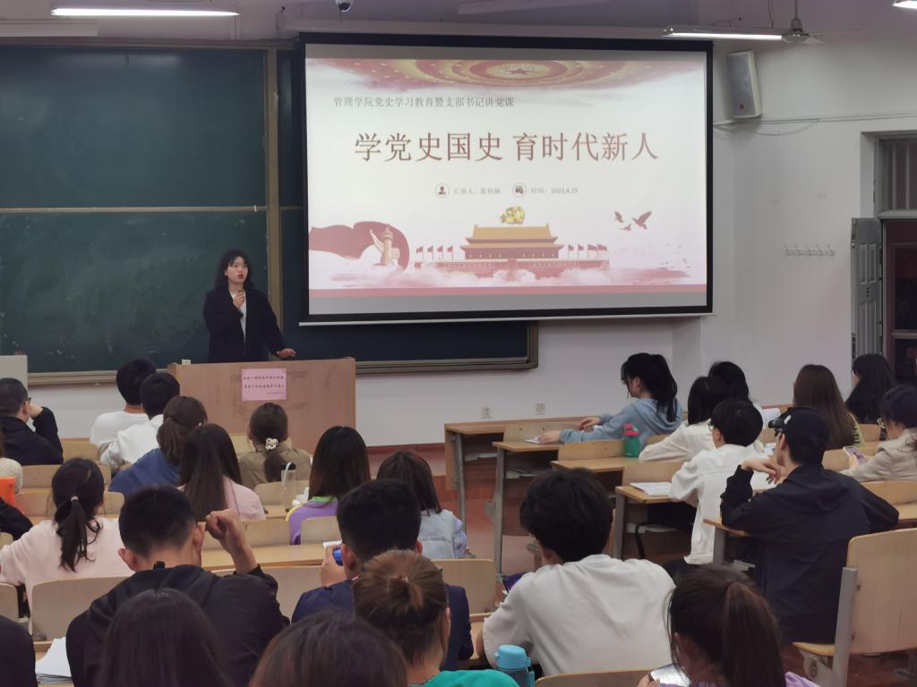 4月29日晚,管理公司党委在临潼校区B135开展党史学习教育暨支部书记讲党课第六讲,工商管理员工党支部书记陈钰娴以“学党史国史、育时代新人”为主题,为公司180余名党员和积极分子讲授党课。