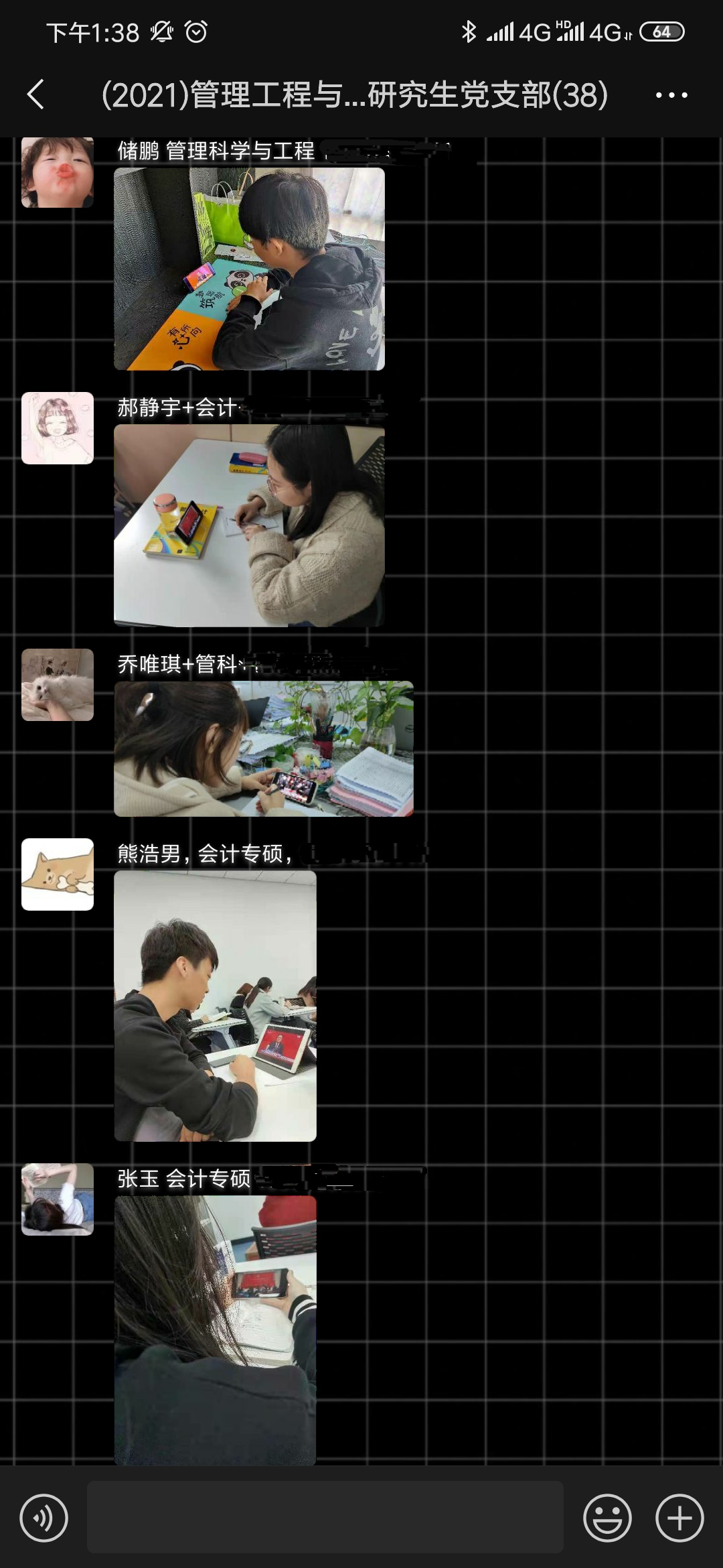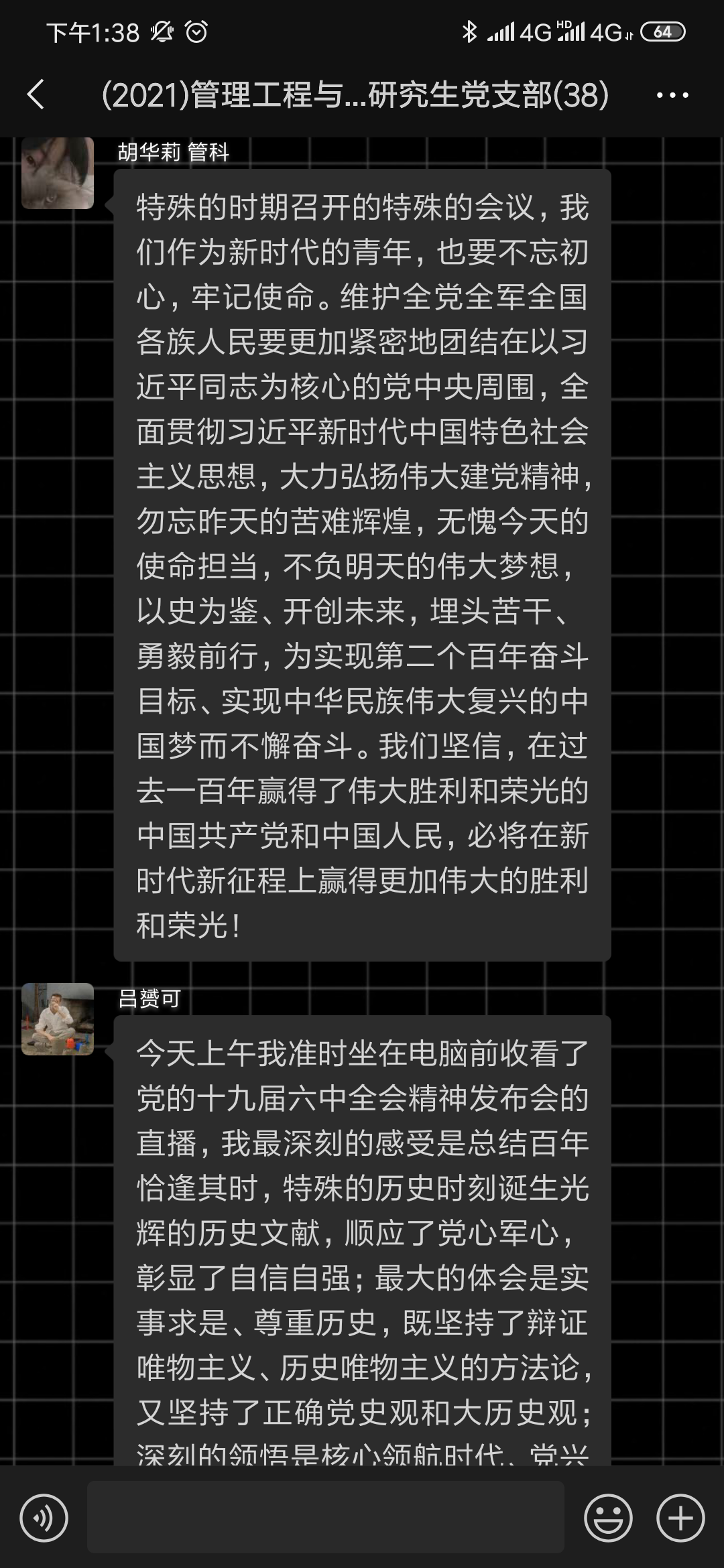 观看完新闻发布会直播后,支部成员在微信群开展了线上学习讨论。李浩同志表示:“党的十九届六中全会是重要历史时间节点召开的一场具有全局性、历史性意义的重要会议。我们要认真学习中国史、党史,要勇担时代使命,延续爱国情怀,坚持社会主义道路,坚持维护党的领导,争做优秀的社会主义接班人。”马渭斌同志认为:“我们要深入学习此次会议精神,充分了解我党的百年奋斗重大成就和历史经验,作为新时代的青年,我们要努力承担起党员应尽的责任和义务,不断充实自己的理论基础,为实现伟大的中国梦贡献自己的一份力。”其他同志相继交流了此次观看党的十九届六中全会精神新闻发布会的体会和认识。
