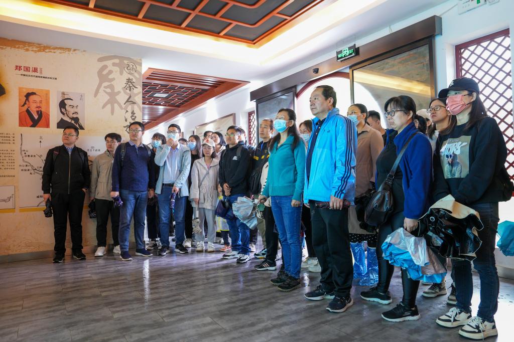大家首先参观了爱国主义教育基地现场教学点—郑国渠遗址博物馆。展馆讲解员向大家介绍了世界灌溉工程遗址郑国渠的修建背景、历史演变、农业灌溉和科学价值,以及郑国渠的保护和申遗历程。在博物馆陈列的平面图和沙盘前,大家详细了解了历代引泾工程渠首上移原因及其河道周围地区的环境演变。在讲解员的带领下,一起回顾了泾惠渠管理局总工程师叶遇春老师初次考察时的情形,了解了古时修渠过程的艰辛和挑战。党员们深刻地认识到郑国渠发展演变历程以及它所具有的伟大意义和历史价值。
