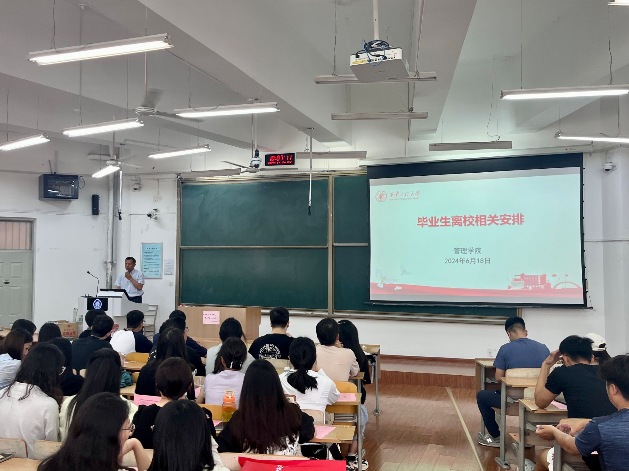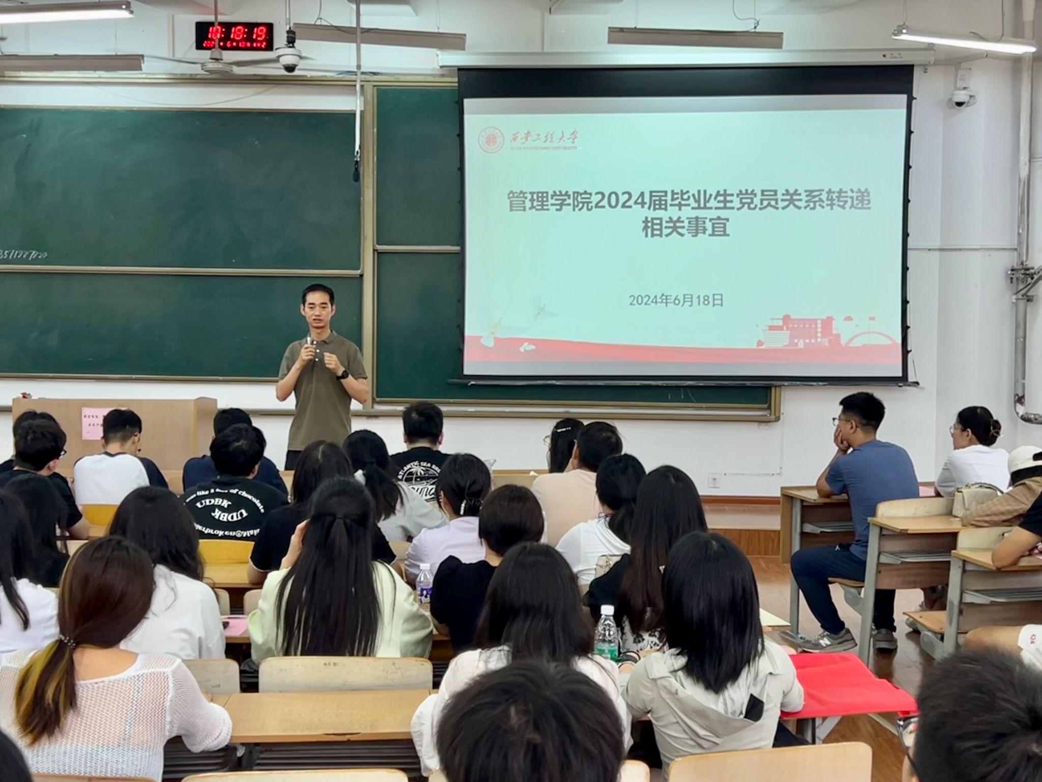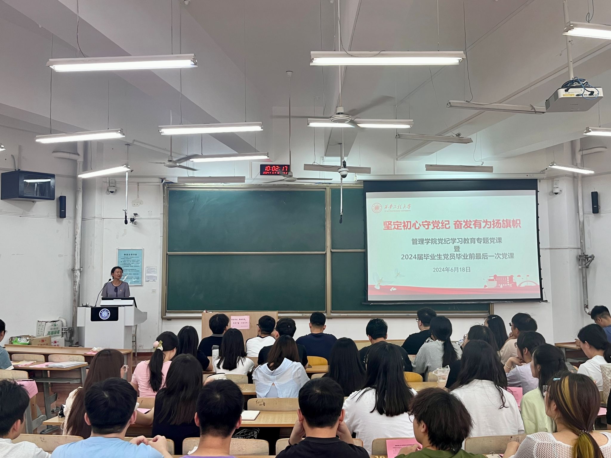 6月18日上午,威廉体育williamhill在临潼校区B137举办党纪学习教育专题党课暨2024届毕业生党员毕业前最后一次党课,公司党委书记王爱华、副书记代锴和全体毕业生党员参加,党课由兼职组织员吴昌敏主持。
