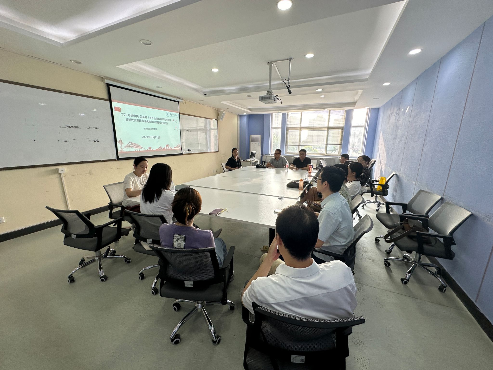 2024年9月25日,工商管理系党支部召开了9月党支部学习会议,工商管理系党支部老师全体参加。会议主要涵盖两项内容:学习中共中央国务院《关于弘扬教育家精神加强新时代高素质专业化教师队伍建设的意见》和“全国党建工作样板党支部”建设讨论。